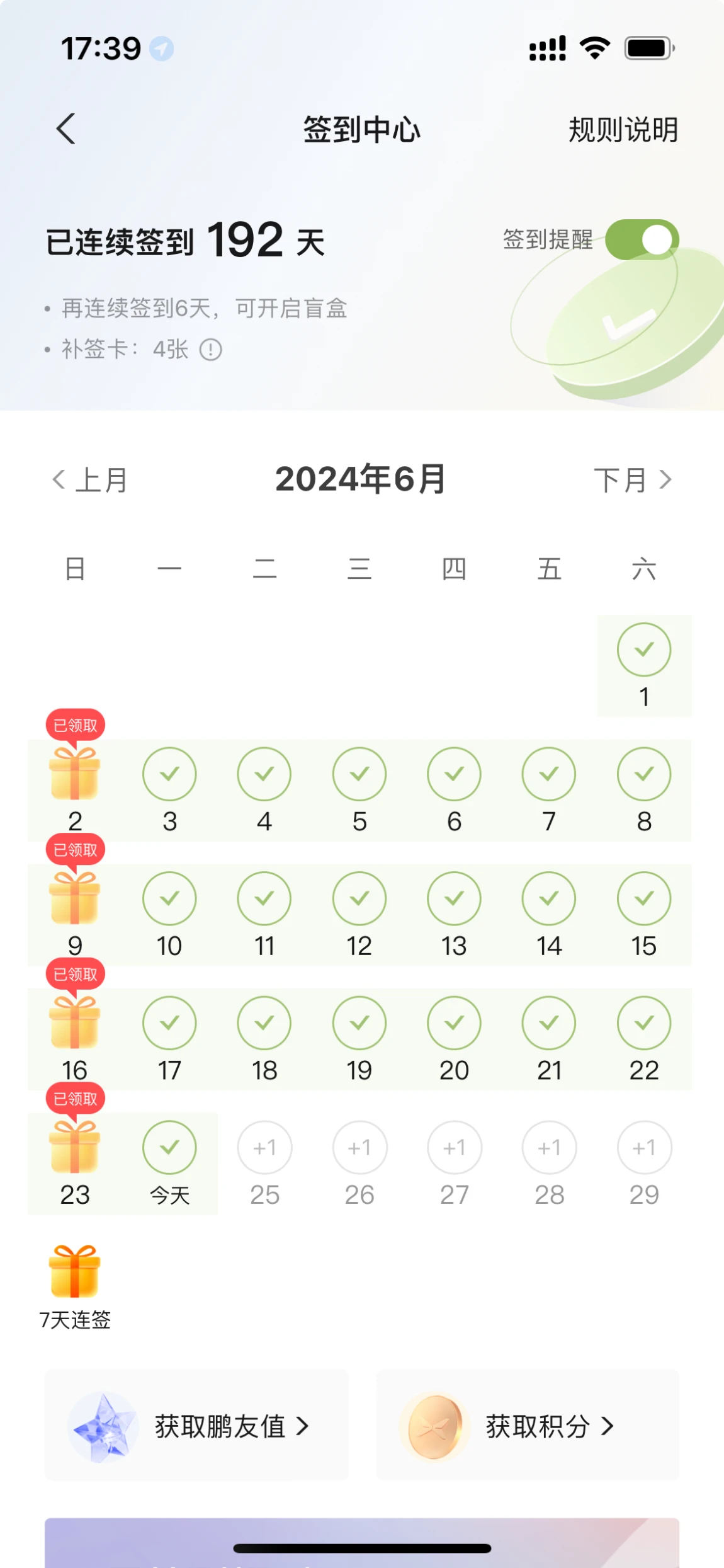 第三阶段: 接受现实,越来越爱!随着用车时间的增加,开始在内心接受 G9 降价的现实,随着天玑 5.1.0 的发布,我有幸被第二批选中加入先锋计划,有幸更早体验到天玑 5.1.0, AI 代驾一下子可以解决之前很多小路无法使用 NGP 的问题,分屏功能,新的 SR 界面,就像换了一台车。自从 520 之后,小鹏更新速度一下子快了很多,现在基本上都是周更了。按这个速度,相信小鹏城市智驾很快就可以从能用,到好用的程度了。期待有路就能开!现在还是小鹏APP 的活跃分子,提车以来,每天坚持签到。第一次在一个 app 上签到坚持这么久的。