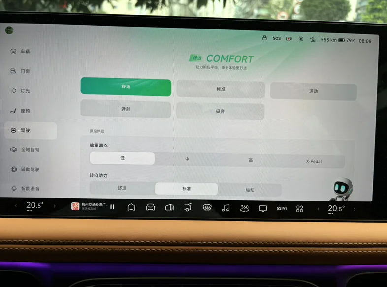 1️⃣.良好的驾驶习惯:G9目前提供了5种驾驶模式,舒适、标准、运动、弹射、极客模式。在日常行驶时,建议还是选择舒适模式,这样无论在什么样的路况下,都不用频繁去踩刹车,平稳的加速和減速可以减少能量的浪费。在高速路段行驶时,可切换至标准模式,因为没有红绿灯,行驶的速度也比较快,标准模式能兼顾动力和能耗。当然运动、弹射模式都是追求性能加速的,就不需要考虑能耗问题了,极客模式就更不用介绍了。