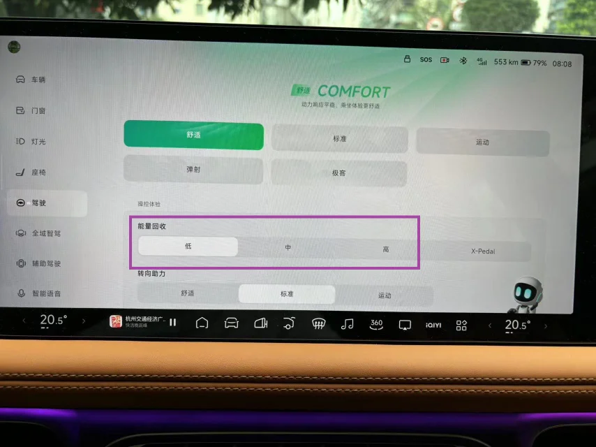 2️⃣.巧用利用能量回收:G9配备了动能回收系统,日常行驶可回收制动过程中的能量。合理利用能量回收功能,可以在一定程度上提升续航里程降低能耗。无论动能回收使用哪种级别,都能带来相应的能耗降低。日常我个人选择的是“低档”,低档模式可以使车辆行驶感受更接近油车,更加平稳,可以对前方路口、路况进行预判,理由车辆惯性进行滑行,有效降低能耗,同时一定程度上的能量回收。如在山区陡坡路段可选择中档或高档,既能提升能量回收,又可以减少刹车磨损。