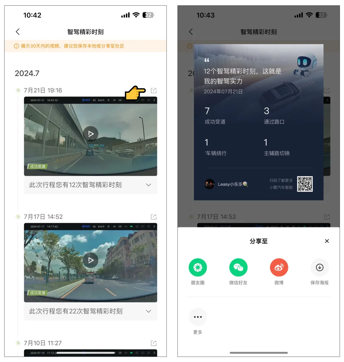 很多好鹏友们最近都刷到了不少智驾高光视频,如何一键快捷分享智驾精彩视频呢?