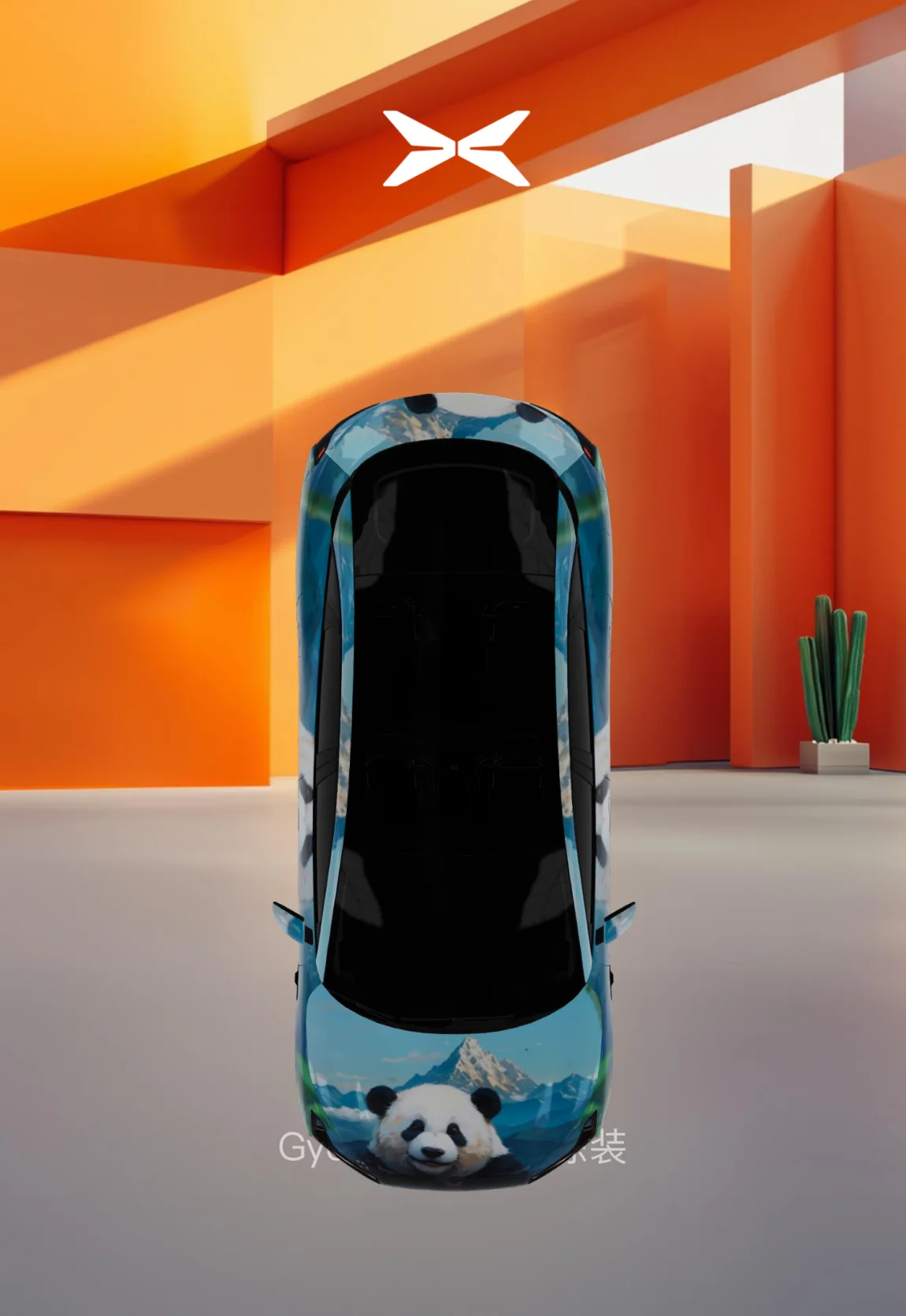 在这个设计中,我们将熊猫的经典黑白配色作为小鹏MONA M03车身的主色调,通过现代化的设计语言,赋予其新的生命力。车身的主要部分使用柔和的蓝色,展现出熊猫的温和与纯净,而雪山则通过亮面处理增加了现代感与动感。