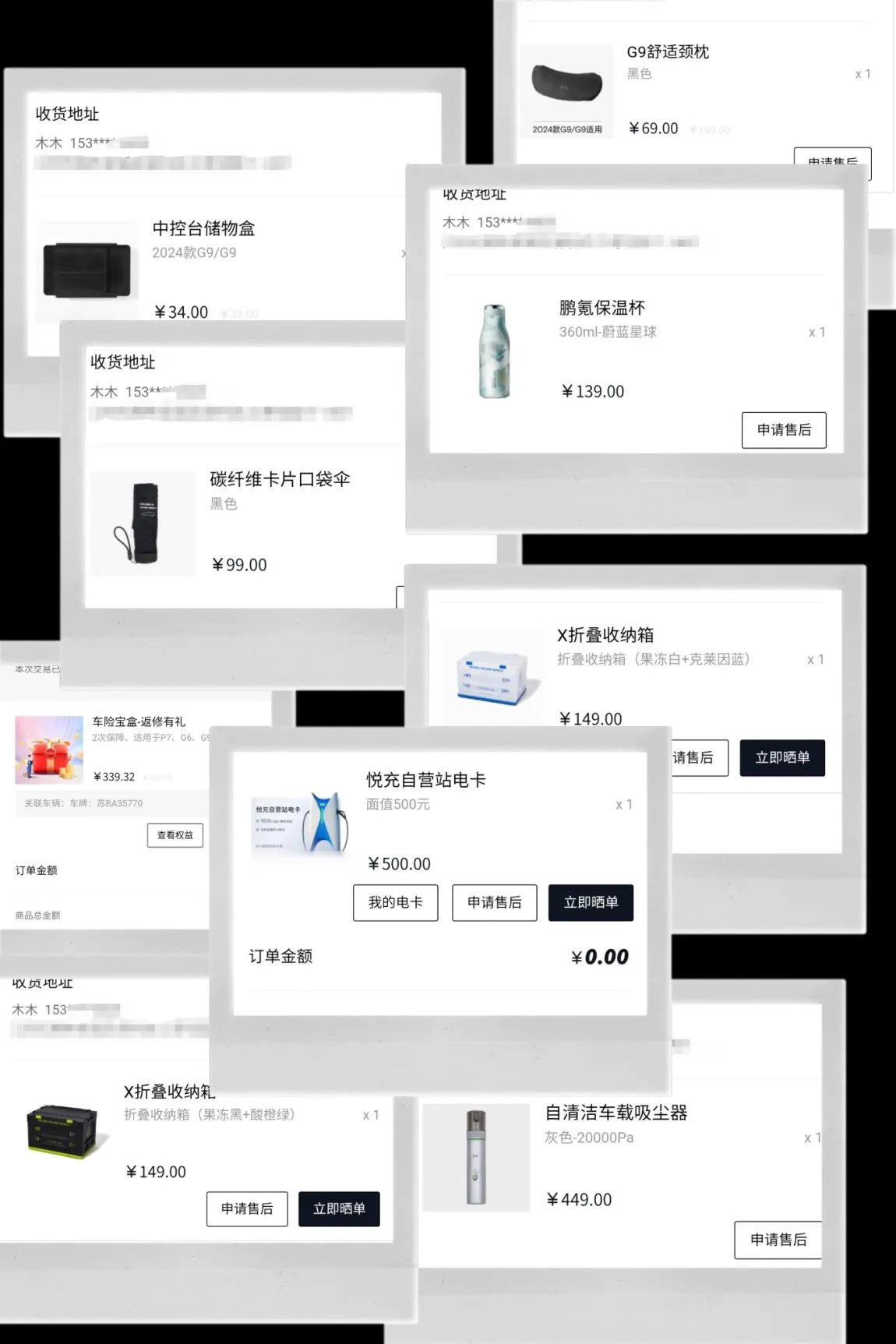 小鹏还有自己的网上商城,为我们提供了各类车载好物。不光有实用车用好物,还有各类维保服务、充电卡等虚拟服务,满足鹏友们的不同需求。在琳琅满目的小鹏商场中扫货,挑选心仪的车载宝贝,优化车内空间,扩展使用功能,为家庭"鹏生活"增色添彩,进一步增强了鹏友们的用车体验。