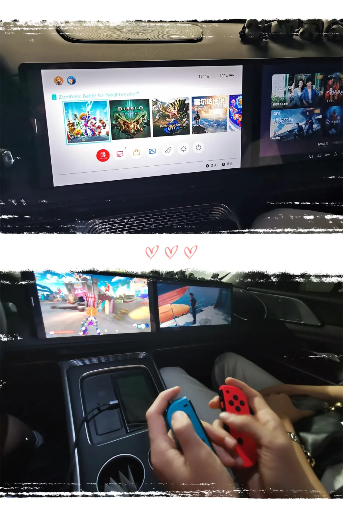 当然,我们还可以在车里连上switch,追剧的追剧,玩游戏的玩游戏,体验新功能,尽兴开怀!