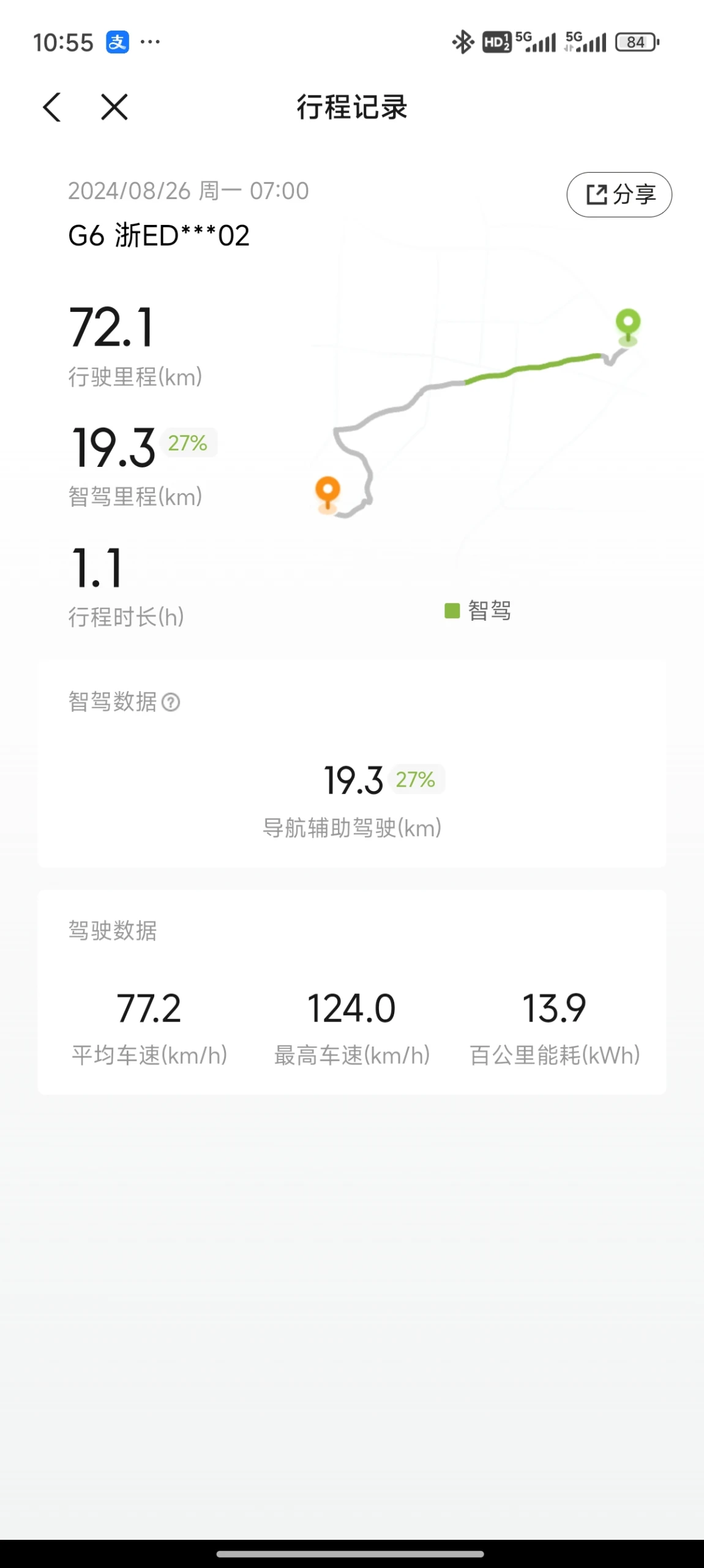 大家都知道高速场景是最耗电的一种情况,我这端路程中除去上下高速应该纯高速路段应该有3/4,算是一个有代表性的数据了,限速120的高速顶着限速开基本能够稳定为13-14之间,其中也不用注意脚法,因为大部分都是NGP在帮忙。