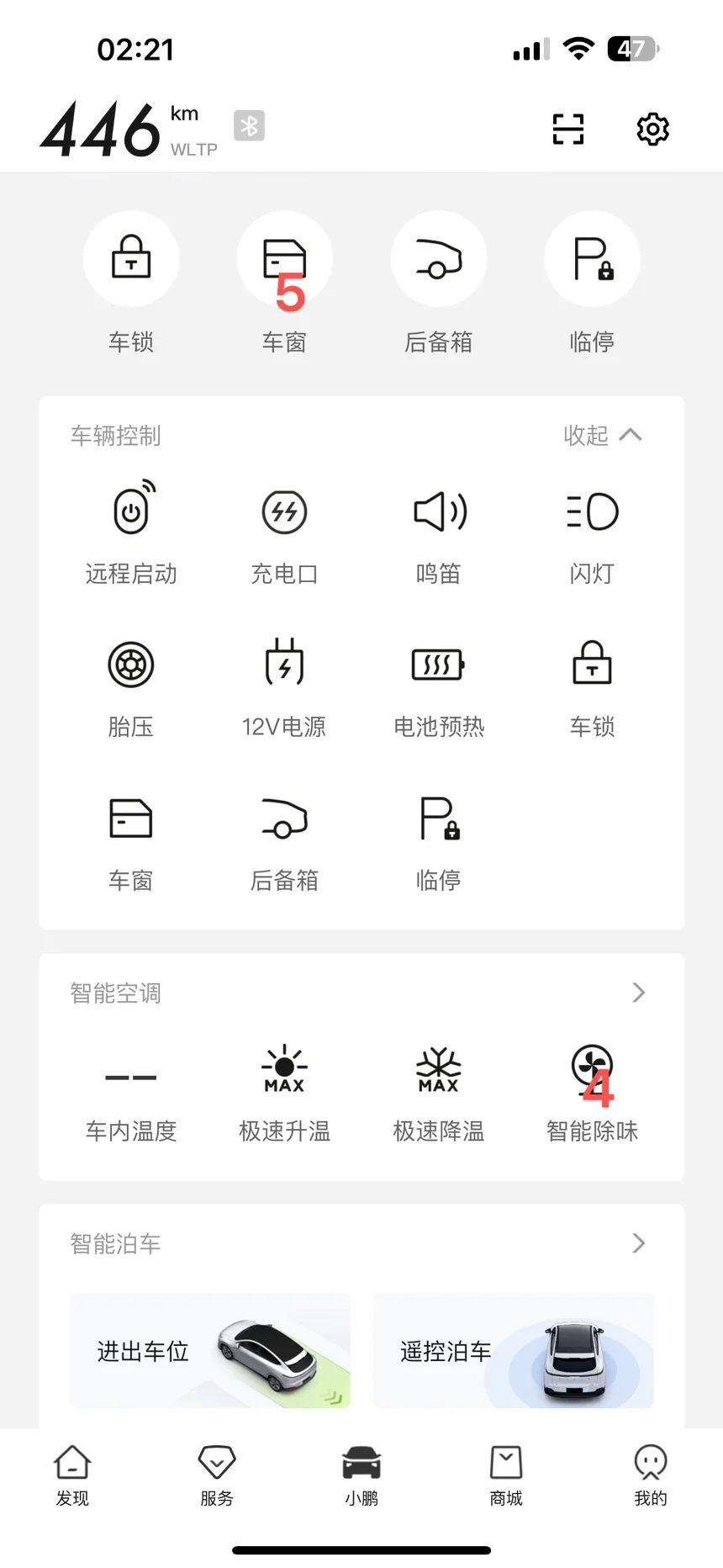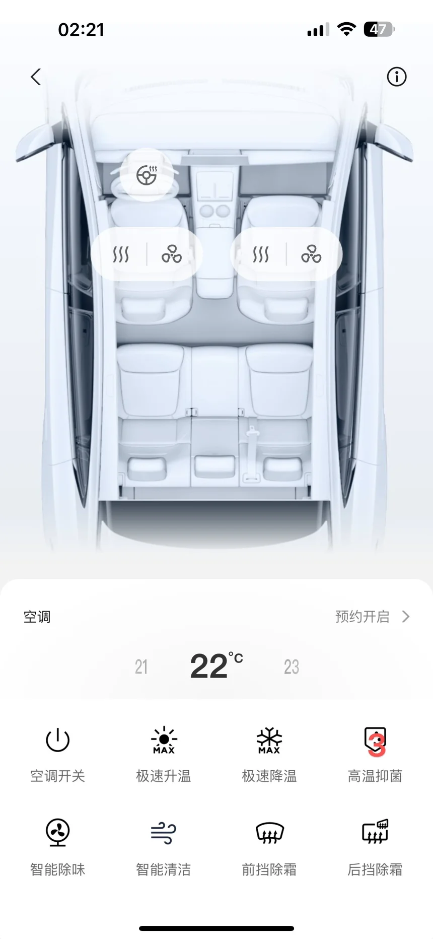 看到这里,大家想说是不是座椅,其实座椅是一个最小的部分。我要说的是整车,所有的手机控制。以前买个车,第一时间是不是找个空旷的地方,全车打开车门,摆一个起飞状态暴晒,然后我们蹲旁边刷手机。现在其实很简单,就只有放地下室,打开加温除菌一小时,然后打开车窗,开始智能除味15分钟,反复有空就开,基本所有异味都可以去除,包括打包吃的东西,在车上残留下来的味道。这个功能最好是停在地下室,防止忘记了关车窗,下午或者小偷的危险。使用顺序1-5,最后面15分钟智能除味关闭后,记得关闭一下窗户。