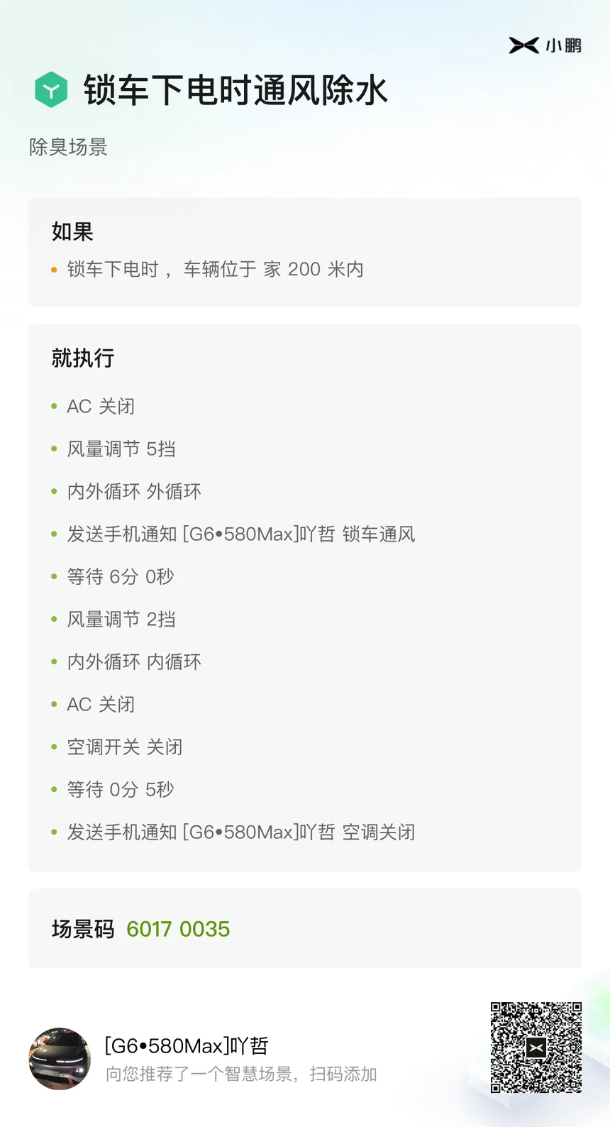 这个大家应该有体验过了,休息,洗车,上车自检,提醒。我把我自己的分享给大家。有一个很好用,就是停车后通风的。不知道大家有没有发现车子上车时候会有霉味,我咨询了很多修车师傅,最后回答都是因为没有发动机,空调冷凝水无法蒸发,干不彻底,出现的发霉现象。我的智能场景有一个解决这个问题,发上来跟大家分享,希望可以帮到大家。