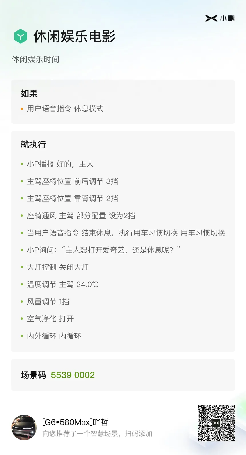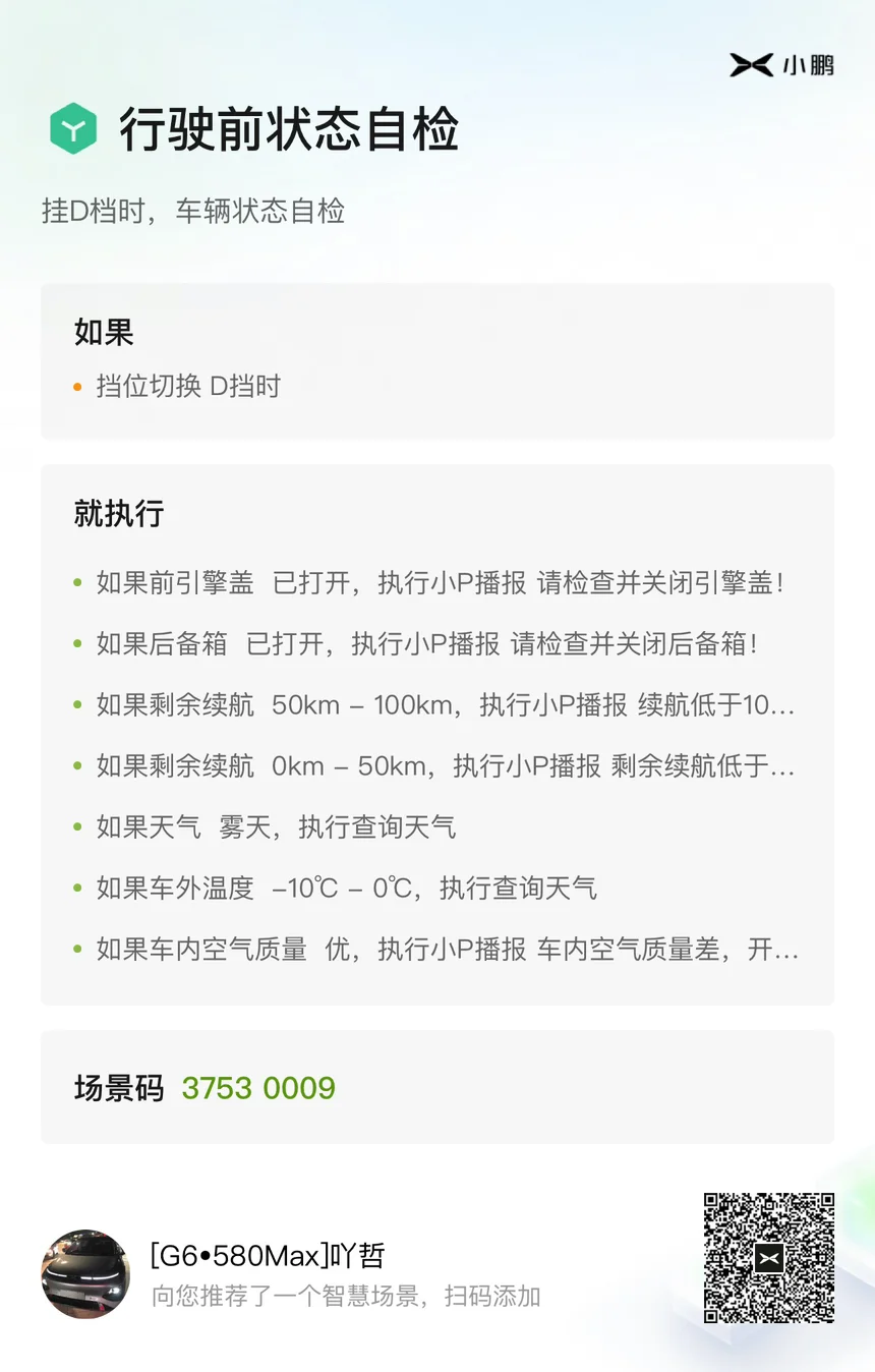 你好,小P。目前是我上车第一时间会唤醒的功能,导航上班,导航回家,开启休息模式。只要能让小P完成的,永远不动手。搭配各种情景模式,给到自己一个最舒适的开车环境,真不要太爽。以前的途观L虽然可以投屏,但是音乐播放和导航,还是没有中控原生态的好,音质调节也没办法调。还有一点我非常想说的,就是小鹏后台售后人员,开放团队,你们辛苦了。每次我们想到的功能,跟你们反馈,基本会得到回应。想想之前的车机,想反馈都找不到人。