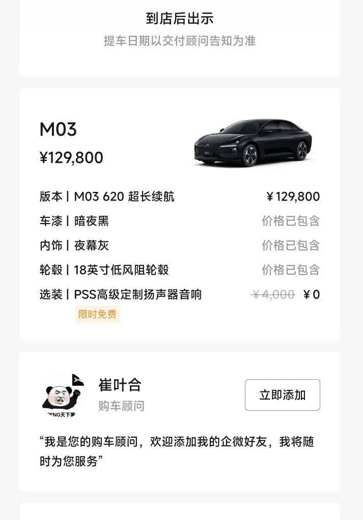 车价129800,交付费用600,盲订99抵扣3000,置换补贴3000,报废国补20000,报废残值2500,保险目前未知