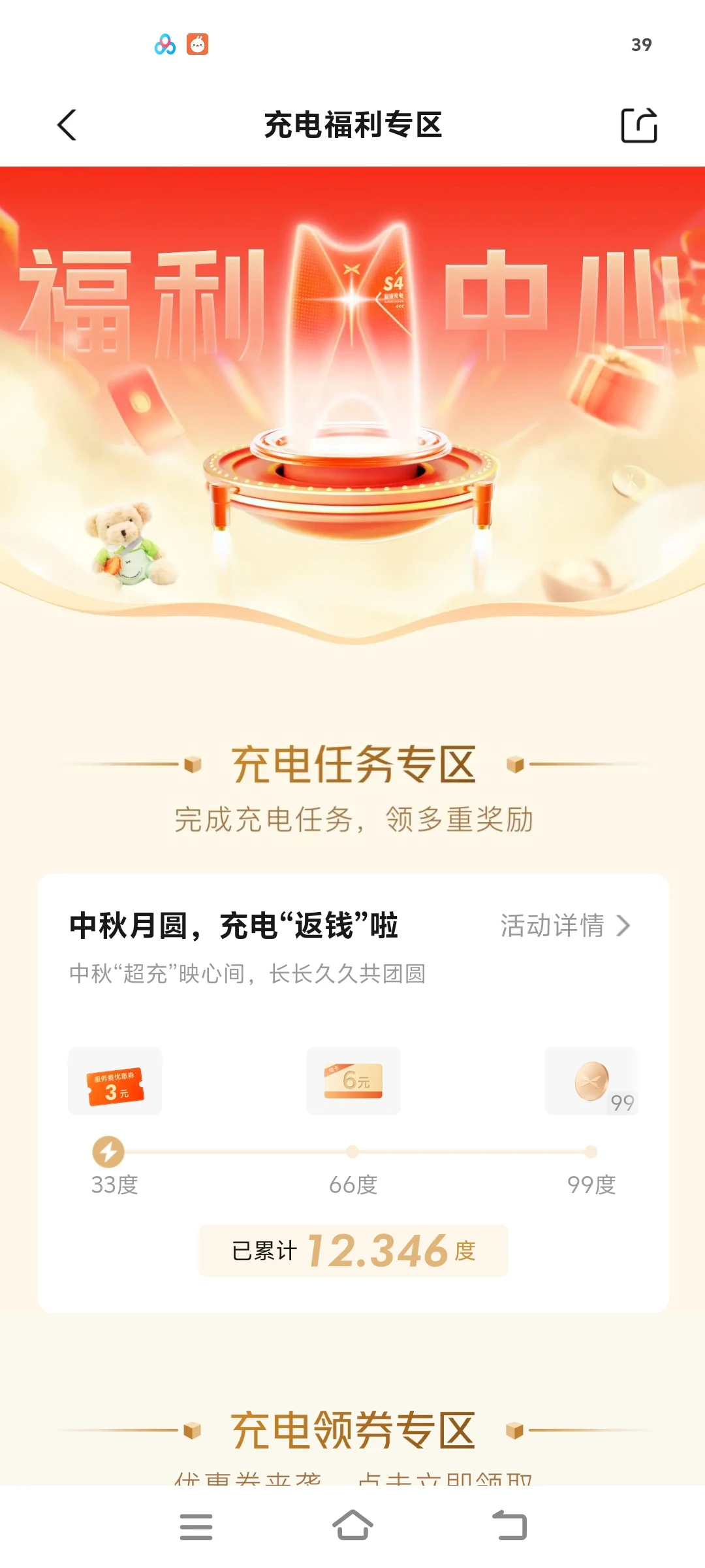 充电完之后,可以在app上的“充电福利专区”查询自己参与活动的进度并领取礼券,充电33度可以领取3元充电服务费礼券,充得越多领得越多,中秋放假这几天大家都去自营充电站充电吧!