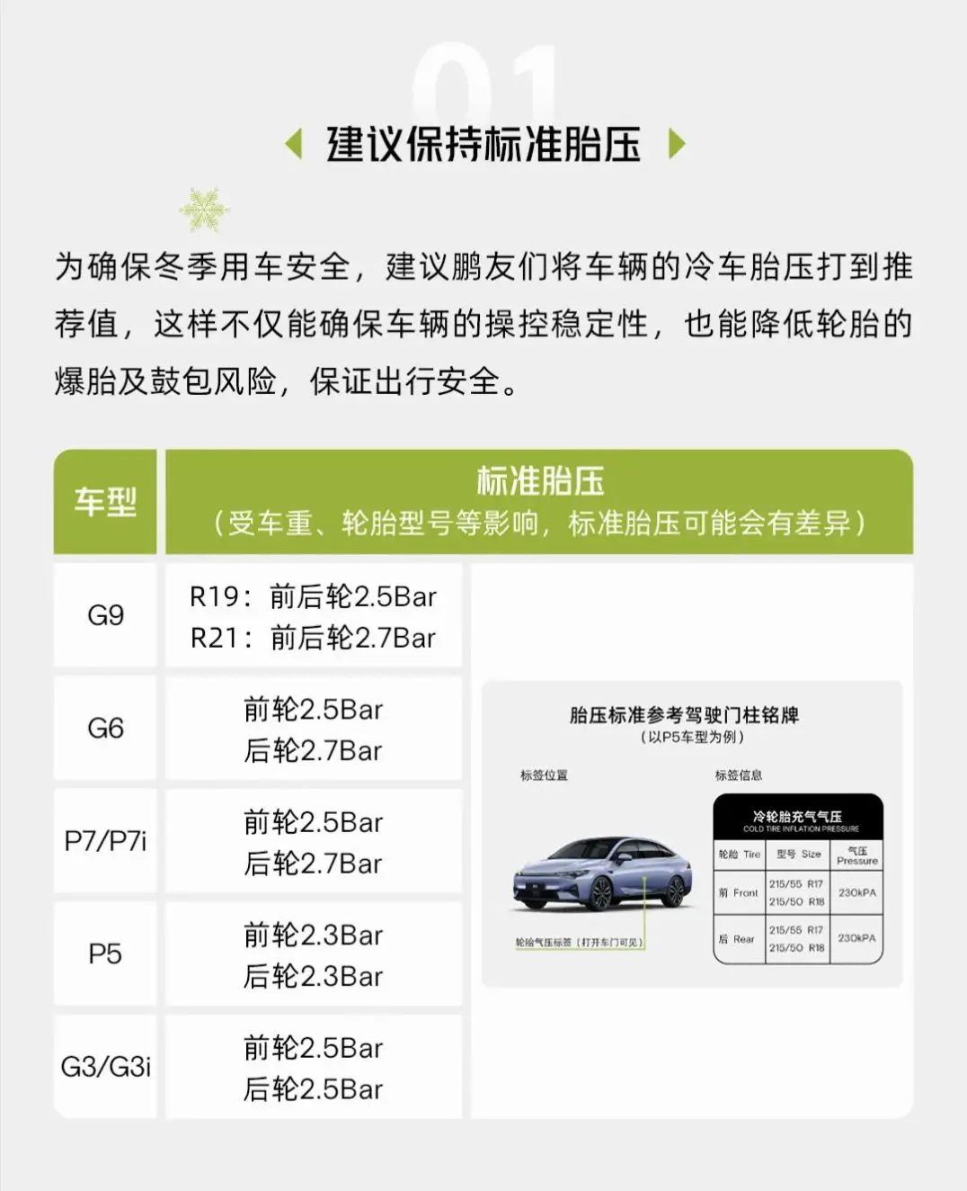 其次就是胎压,官方针对我们每个车型都有建议胎压,正确的胎压能为我们用车带来最好的综合体验,胎压过低能耗就会增加,附上官方对部分车型建议的胎压表格。