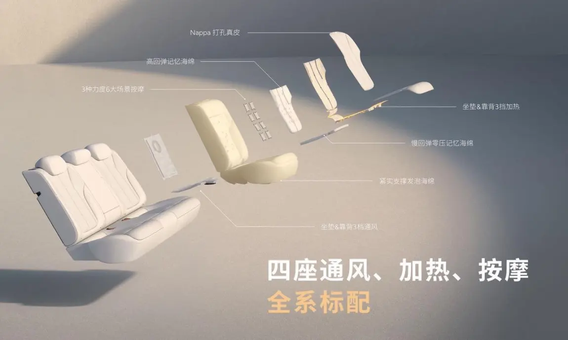 后排座椅电动调节、NAPPA真皮座椅、7.1.4高保真HIFI音响、8英寸后排屏、四座通风+加热+按摩,甚至MPV小桌板......统统全系标配!