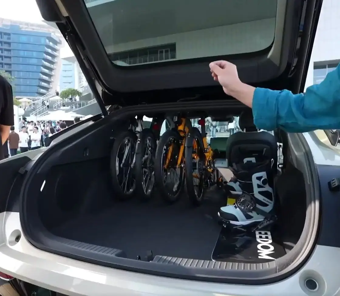 不拘泥于轿跑的长车头设计,将A柱前移,把轴距让给乘员舱,重新定义了轿跑。用“家用”“超大空间”贯穿了整场发布会,“轿跑的姿态、SUV的空间、MPV的舒适”P7+全都要!掀背造型的尾门带来的空间甚至可以立着放进山地自行车!