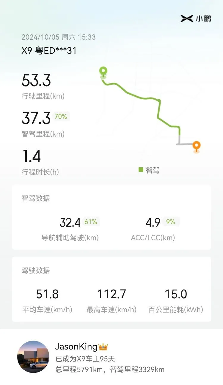 抓住国庆假期的小尾巴,带上一家人来一趟说走就走的短途旅行。说是说走就走,但是上有老下有小的,这短程又不是那么简单——不单要节目相对丰富,既照顾到活跃少年玩学的好奇心,又不能太辛苦最好是点对点下车游人不多适合老年人的。不过这都难不到我,自从买了X9方便全家老小出行,这种小策划已经是小case难不倒我了。近近地(广东话🤭),就去三水云东海兜兜风吧,然后到附近和夫人曾经的母校广东财经大学三水校区探访母亲久未见面的导师叙叙旧,顺便提前让小孩感受一下大学氛围,真不失兼顾各方又有意义的旅程!全程智驾比例达到67.5%,平均能耗16.2kw/h,作为一台载上六人的大型MPV,这个数据已经很可了!🉐🉐🉐✔️