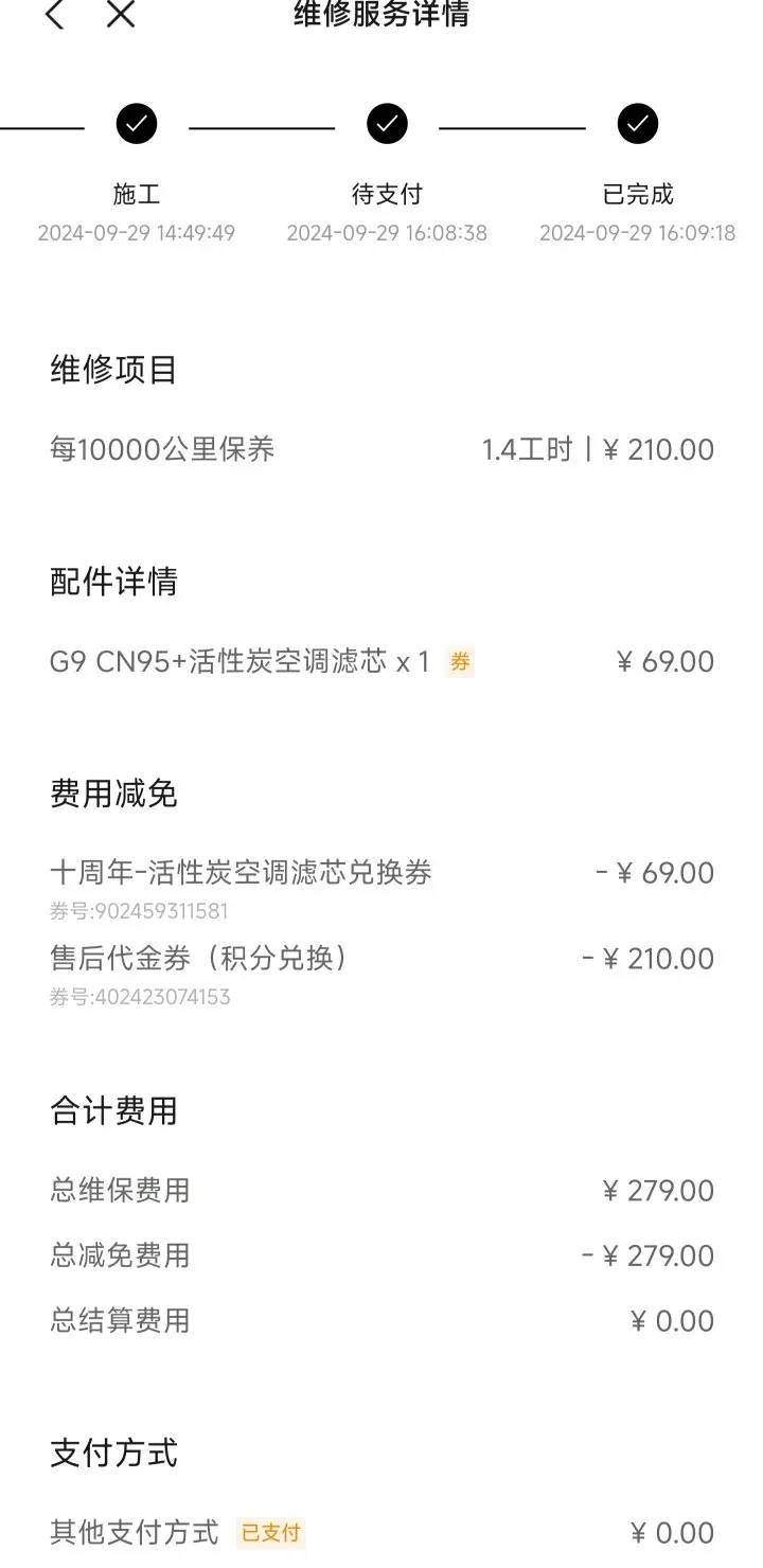 交车:二保只更换空调滤芯和基本检测,正好十周年发了一张滤芯券,剩余检测➕工时总花费210,然后用积分抵扣,相当于“不花钱”,一个小时多一点保养完成,车洗干净,小姐姐一直送到车前。