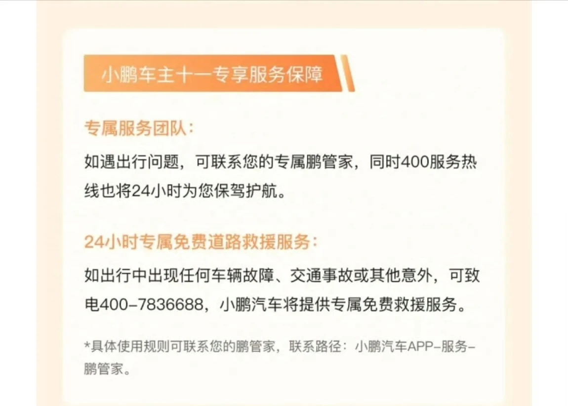 特殊节日的关照:赶上国庆节,小鹏还为保养车主送了小礼品,手提袋里有水、小零食和一面小红旗,虽然不值钱,但很有仪式感。此外国庆假期小鹏还特意向所有车主提供了24小时免费救援服务。