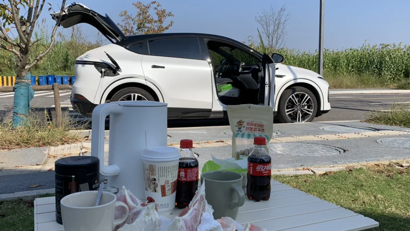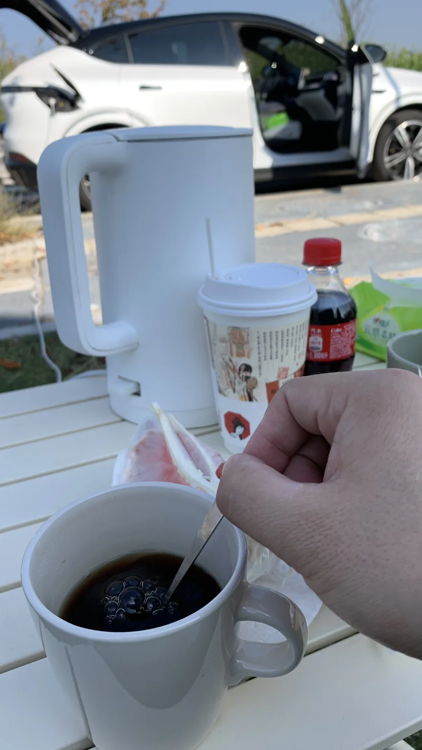 车停在旁边,用上买车时送的这个放电器,连接接线板,带个了烧水壶,煮上一壶香浓的咖啡☕️喝喝,这个感觉很惬意!