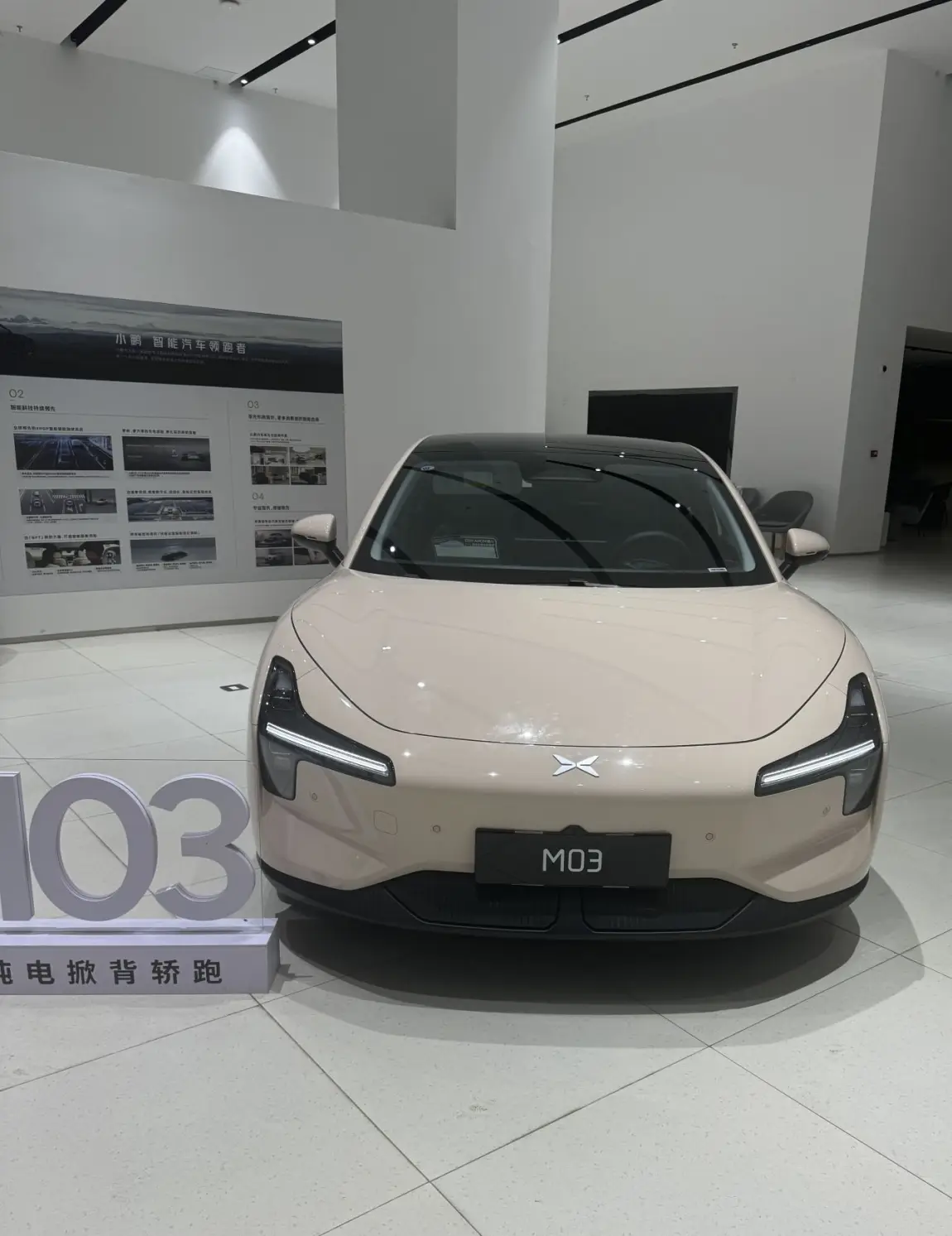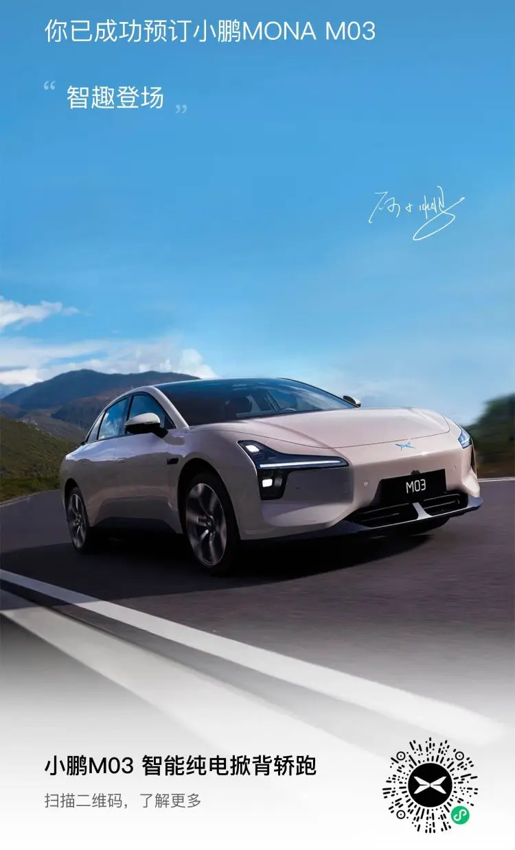 小鹏的销售服务中心就在E5不远处,无意中从外面刷了一眼,一辆米色外观时尚霸气有点你跑车的车收获我的视线,被她成功牵引进店看车——MONA M03!外观一圈下来没得说,有人说屁股大不好看,我觉得是一种丰满美,就跟男人看女人一样,各人眼光不一而已。内饰让我耳目一新,太简洁了,以前没看过特斯拉,后来才知道几乎跟特斯拉一样。是我喜欢的类型!价格当时说是12.3万预售起(具体记不清了),也符合我的预期。因为没有试驾车,只能凭目测,算是比较喜欢。回来后,销售跟我联系,建议我99元小订一个,能抵3000车款,不买还能退,果断下订,并要求试驾车来了第一时间通知我。