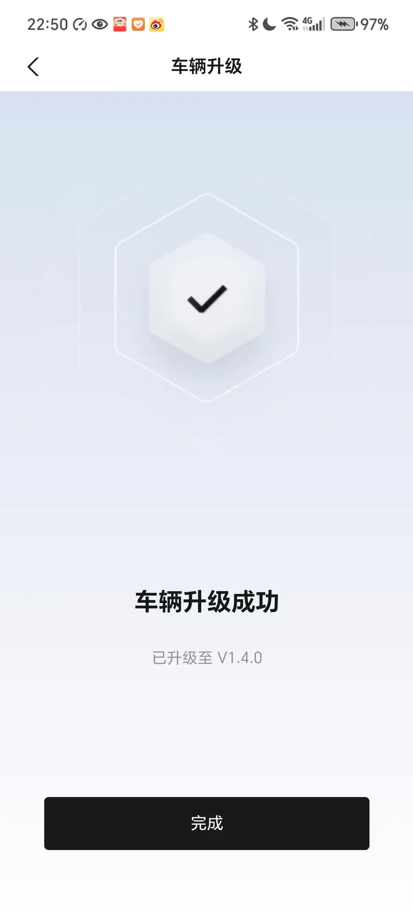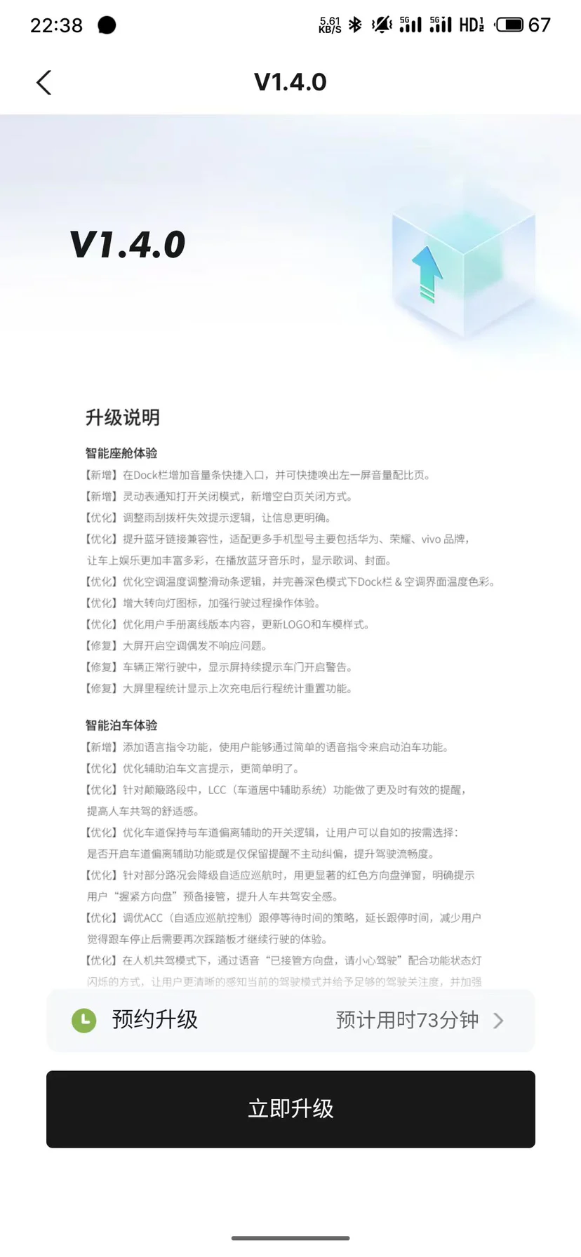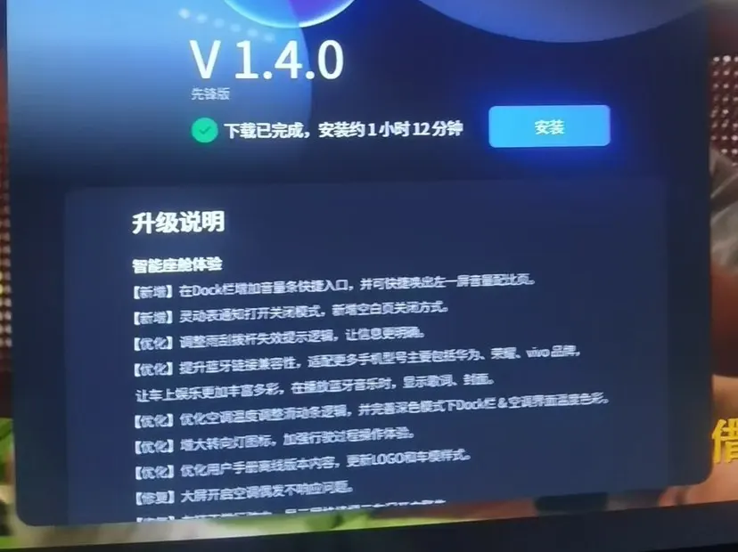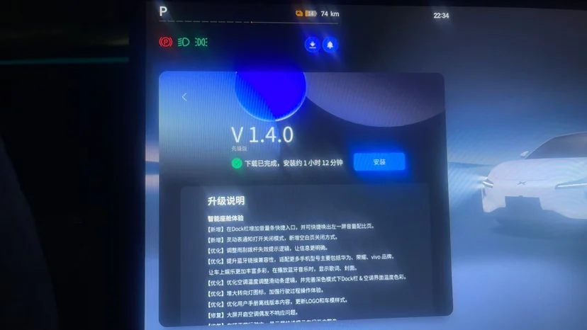 整个升级过程持续约一小时,期间车辆保持静止状态。这段时间我可以自由安排其他活动,不需要过多关注车辆状态。最终,升级顺利完成,系统版本成功更新到v1.4.0。