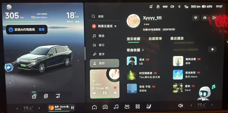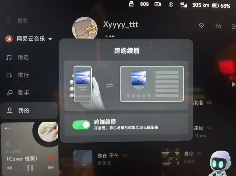 1⃣️这次升级后有一个很有趣也非常令我感到意外的功能,就是音乐跨端续播,如果你的手机正在播放歌曲,那么在你上车之后手机里的歌曲直接会在车机播放,不用再单独去点歌了,虽然在很多人看上去不起眼的功能,但确实是有用。在车机端登录自己的网易云账号,打开跨端续播功能