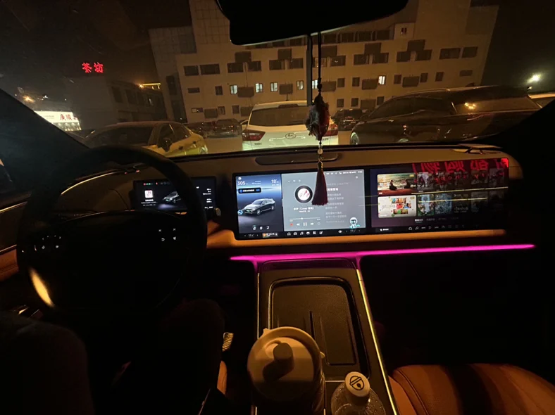 另外如果刚下班有些累并不想直接回家的话,我也可以直接在副驾驶调整好座椅升起腿拖,聆听在下班途中选好的歌曲,跨端续播享受自己的“零重力”再加上氛围灯的加持,属于自己的自由空间,鹏友们谁懂啊!