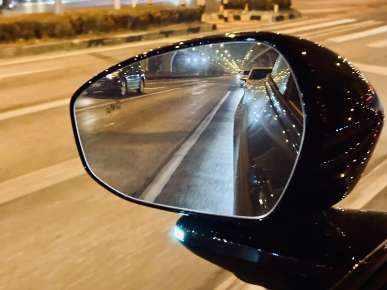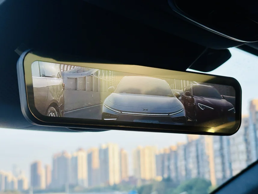 路途中偶遇一辆银色P7+,透过流媒体后视镜观察,科技感十足。