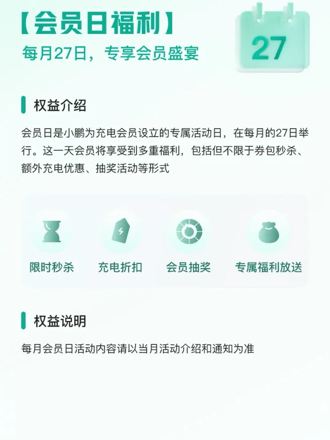 在每月的27日,小鹏官方会放出限时秒杀、充电折扣、会员抽奖、专属福利放送等更加优惠的政策,大家一定不要错过哦。