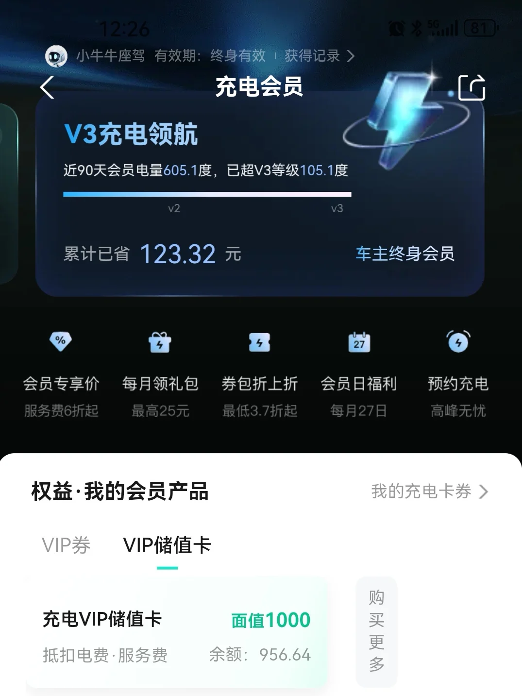 优化后的VIP会员界面,增加了等级功能,分为3个等级,而且不同的等级官方给予不同的优惠,由于我每个月都在自营站充电,直接被升到了最高级——V3级别,每个月有25元的优惠券可用,其中20元是购买电卡的减免券,5元是日常充电的减免券,非常划算😍!