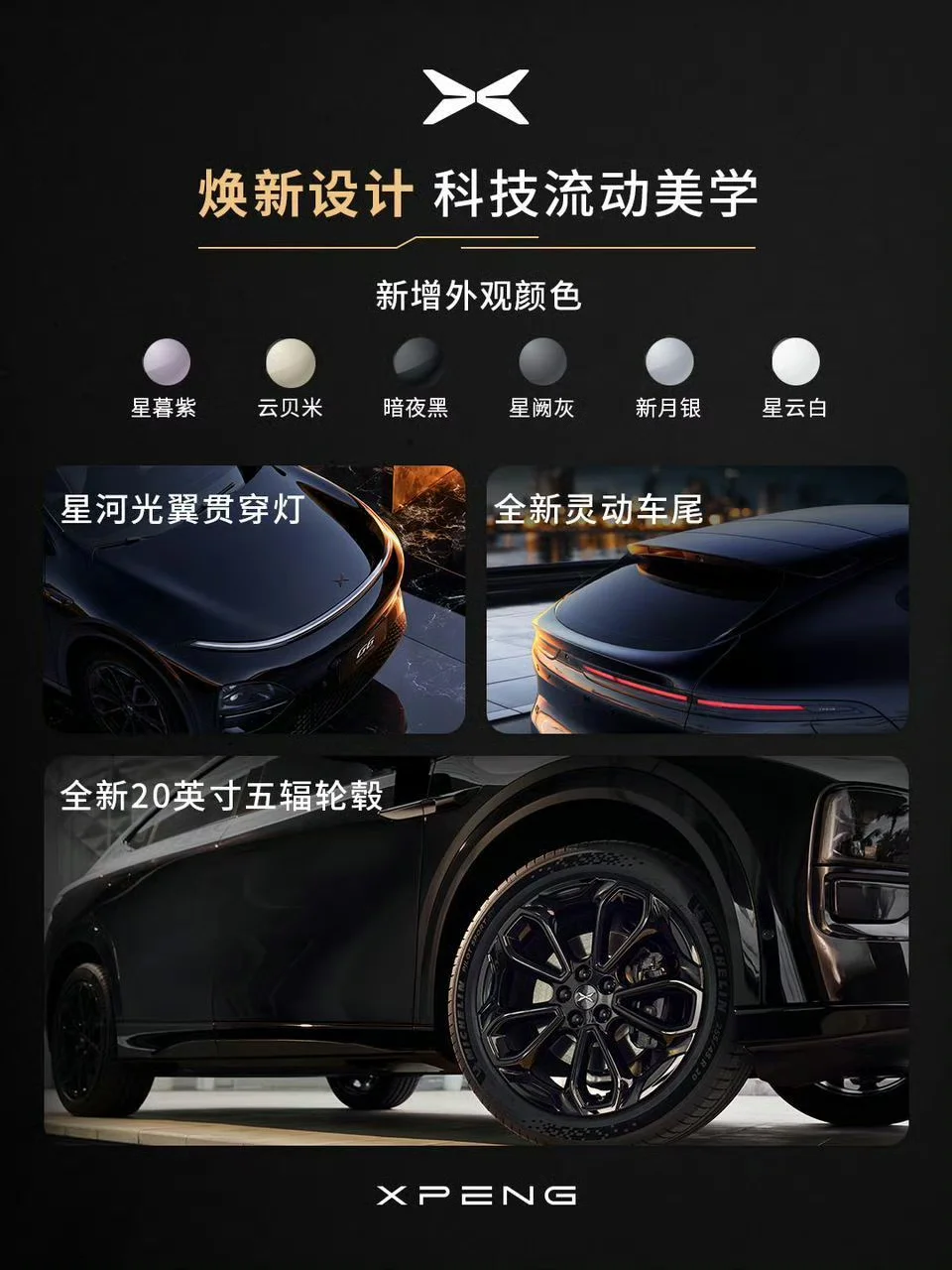 外观上,2025款小鹏G6秉持科技流动美学,新增星暮紫、云贝米等多种外观颜色,为用户提供了更丰富的个性选择。星河光翼贯穿灯极具辨识度,全新的灵动车尾设计搭配20英寸五辐轮毂,不仅提升了整车的颜值,还彰显出独特的运动气质。