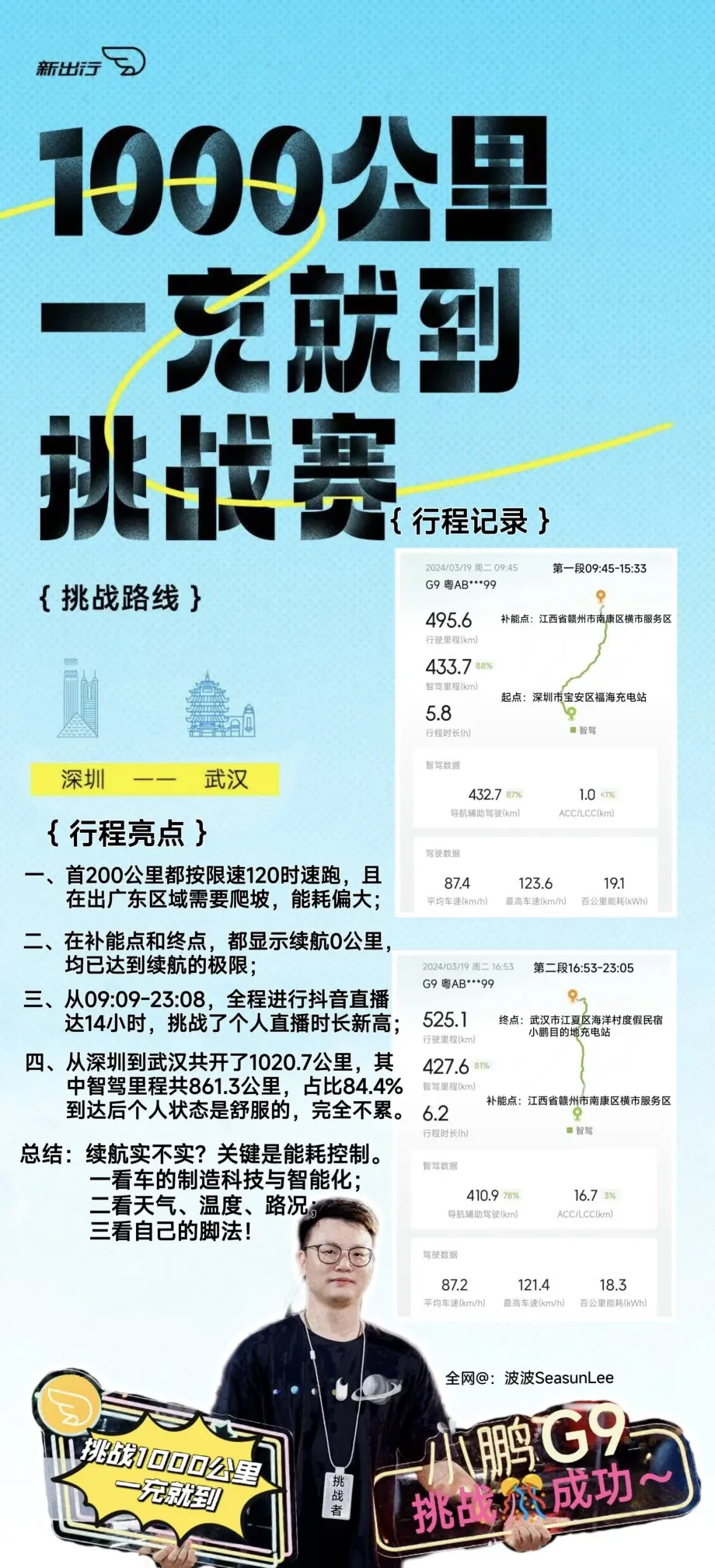 24年三月参加了新出行社区举办的「1000公里一充就到挑战赛」,我的G9在满电出发的情况下,中途只需要充一次就可以由深圳自驾到武汉!1000多公里全程直播,真实经历!