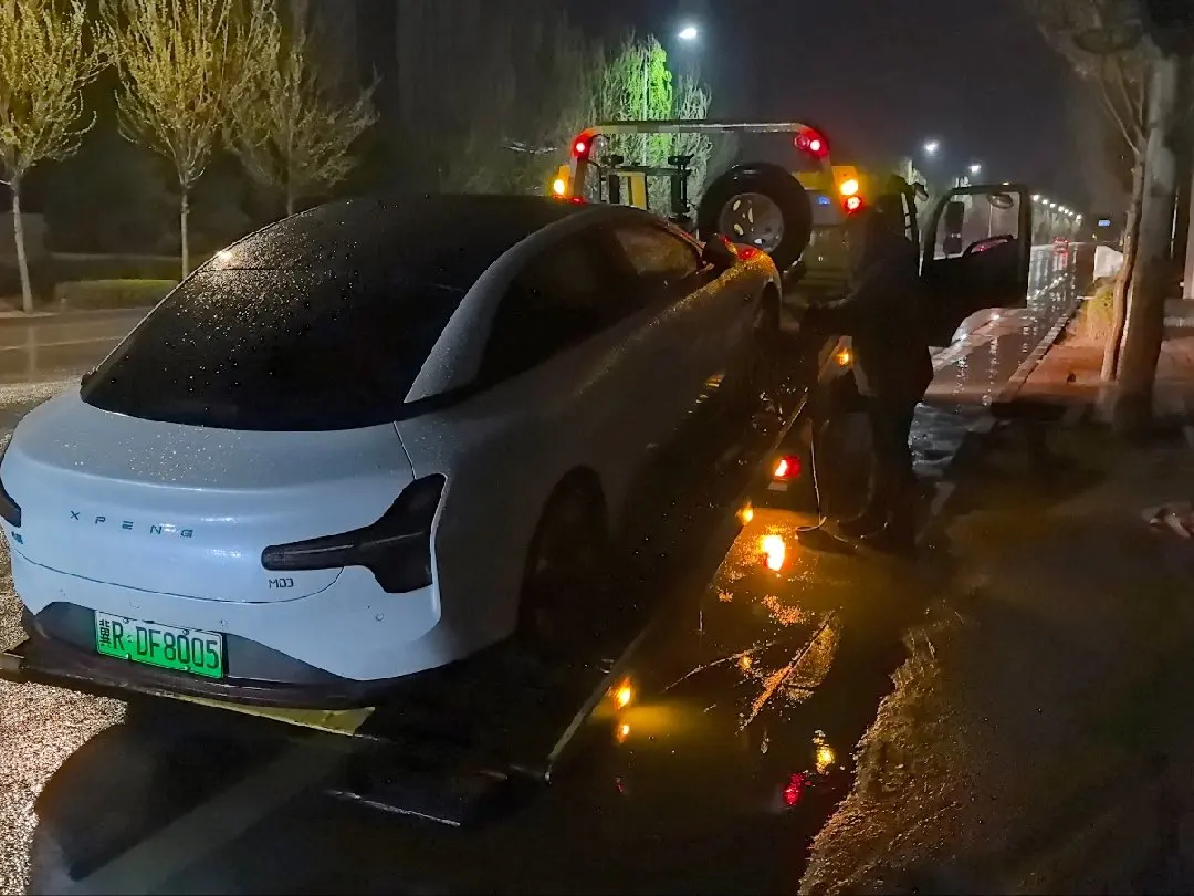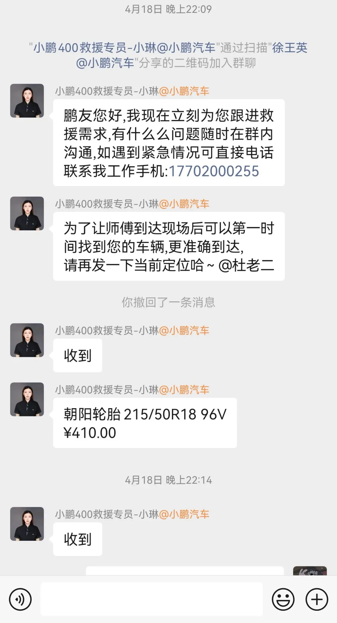 23:00左右拖车就闪着灯出现了!师傅说是小鹏合作的24小时救援团队,还打趣说"您这离目的地就3公里,但该拖还是得拖"。全程帮我处理好手续,拖上车把所有的安全隐患都检查了一遍,拖车师傅那叫一个热情,下着雨让我们上拖车里等着别淋雨,司机师傅一人忙碌着让我确实有些不好意思。最让我感动的是,从呼叫到拖车抵达不到半小时,而且完全免费(连夜间服务费都没收)!而且大半夜管家群还没有休息,还给我轮胎报价410元,说实话真心不贵大半夜的,但是锦州市没有小鹏店得拖到100公里外的葫芦岛市区,因为着急用车出行,没有办法我只能在锦州市里换了一条轮胎收了500元😂。