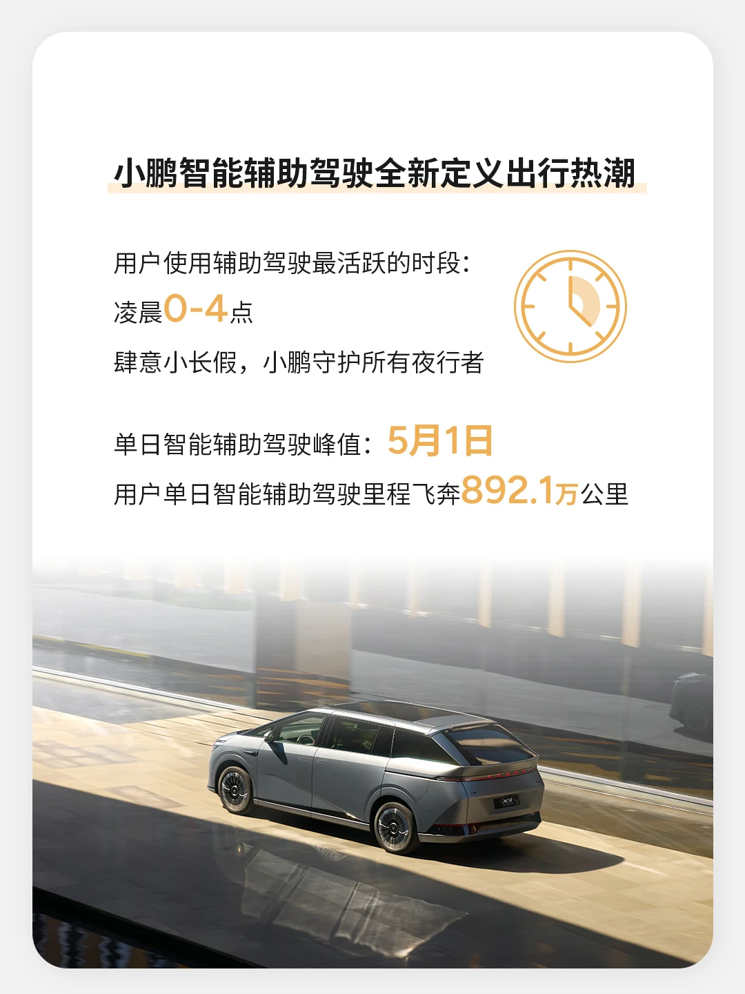 小鹏AI智能辅助驾驶五一出行报告出炉,单日智能辅助驾驶里程超892.1万公里!