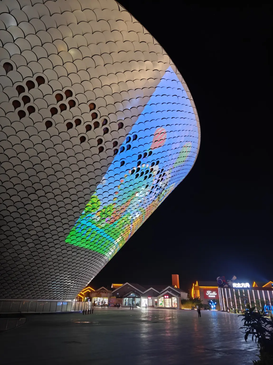这个“大碗”高80米,口部直径80米,底部直径40米,是目前全球最大的碗形建筑。设计灵感以宋代湖田窑影青斗笠碗为原型,外观庄重典雅,外墙采用纳米喷涂铝单板,呈鳞片状叠瓦式布局,白天洁白如玉,夜晚通过4D投影技术呈现八种变幻色彩。