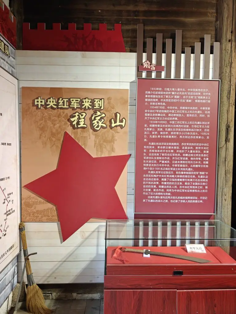 离开宗祠之后,我们来到了工农红军悲伤抗日先遣队旧址。1934年7月,由寻淮洲(据导游说,寻淮洲当时是战神粟裕的领导,是个鬼才军事家,可惜英年早逝。)、乐少华、粟裕领导的红七军团改称中国工农红军北上抗日先遣队。经福建北上到闽浙皖赣边区,与方志敏领导的红十军会合,组成红十军团。根据展厅宣传画面得知,1934年10月8日,中国工农红军北上抗日先遗队到达浮梁皖鞋特委及时赶到兴田港西村迎接,引导红军主力驻扎程家山、龙源。先遗队在浮梁及院南转战20余天,历经流口、新桥、储田桥鸦桥等大小20余次战斗。