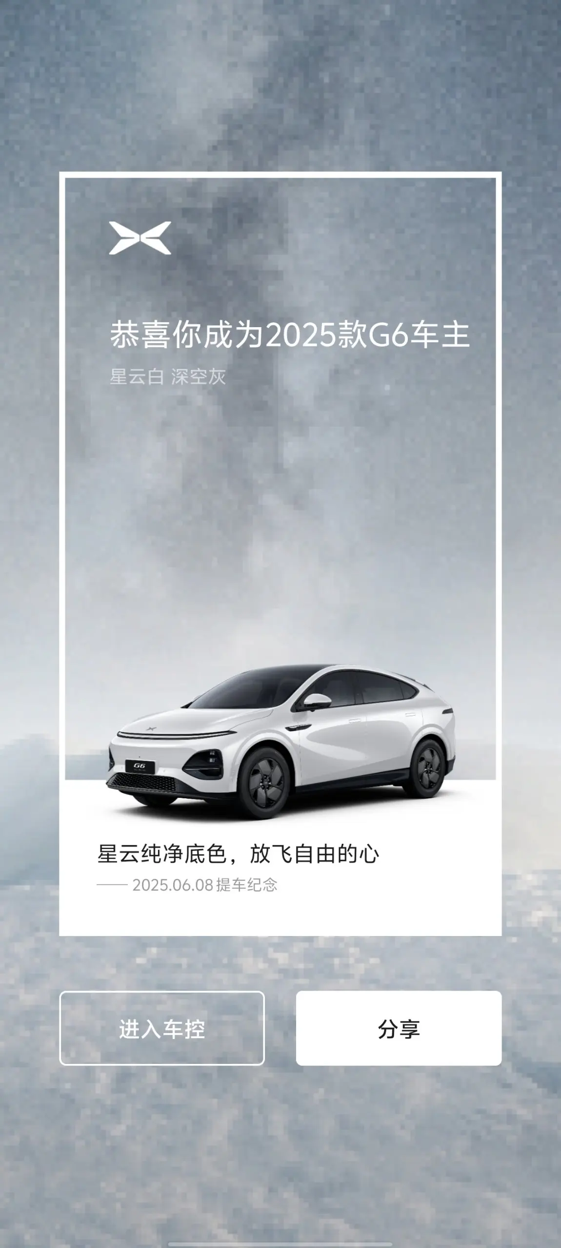 G6初体验很满意,续航扎实,基本做到了表显和实际1:1,外观内饰做工细致,车机小p使用起来很流畅,没有人工智障的感觉。更多惊喜日后更新,respect