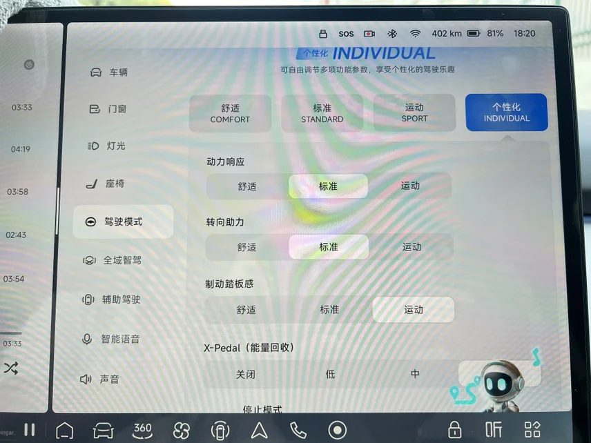 自从把驾驶模式更换为【自定义】后,小P如“脱胎换骨”,高速车体不来回晃动了,刹车不点头了,油门反应也顺了。【自定义模式】给大家分享。