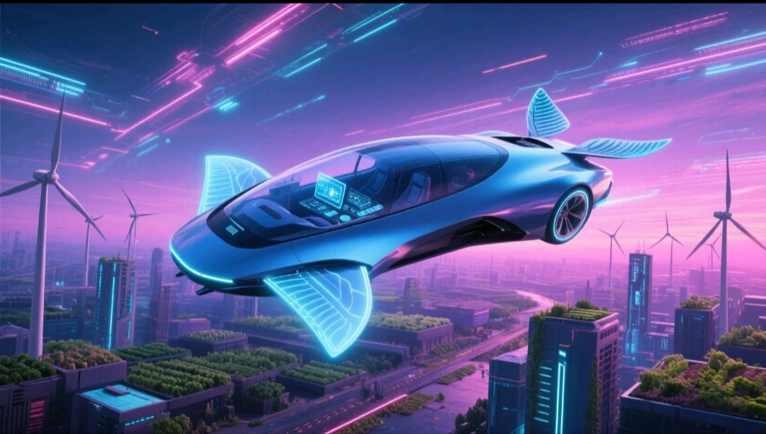 未来智能座驾可以翱翔天际和海底遨游,上天入地无所不能,包含炫酷的外形,智能的座舱,全自动驾驶,绿色低碳,续航无限。实物效果如图:流线型车身散发幽蓝光泽,半透明座舱内悬浮着全息控制界面。车身两侧展开光子翼板,尾部延伸出仿生鱼鳍状推进器。地面是生态都市的垂直农场与风力发电矩阵,空中航道交织成光轨网络。整体呈现赛博朋克与自然生态交融的意境,采用高饱和度霓虹色调搭配冷金属质感,画面追求超现实主义风格的极致细节表现。@鹏友大管家