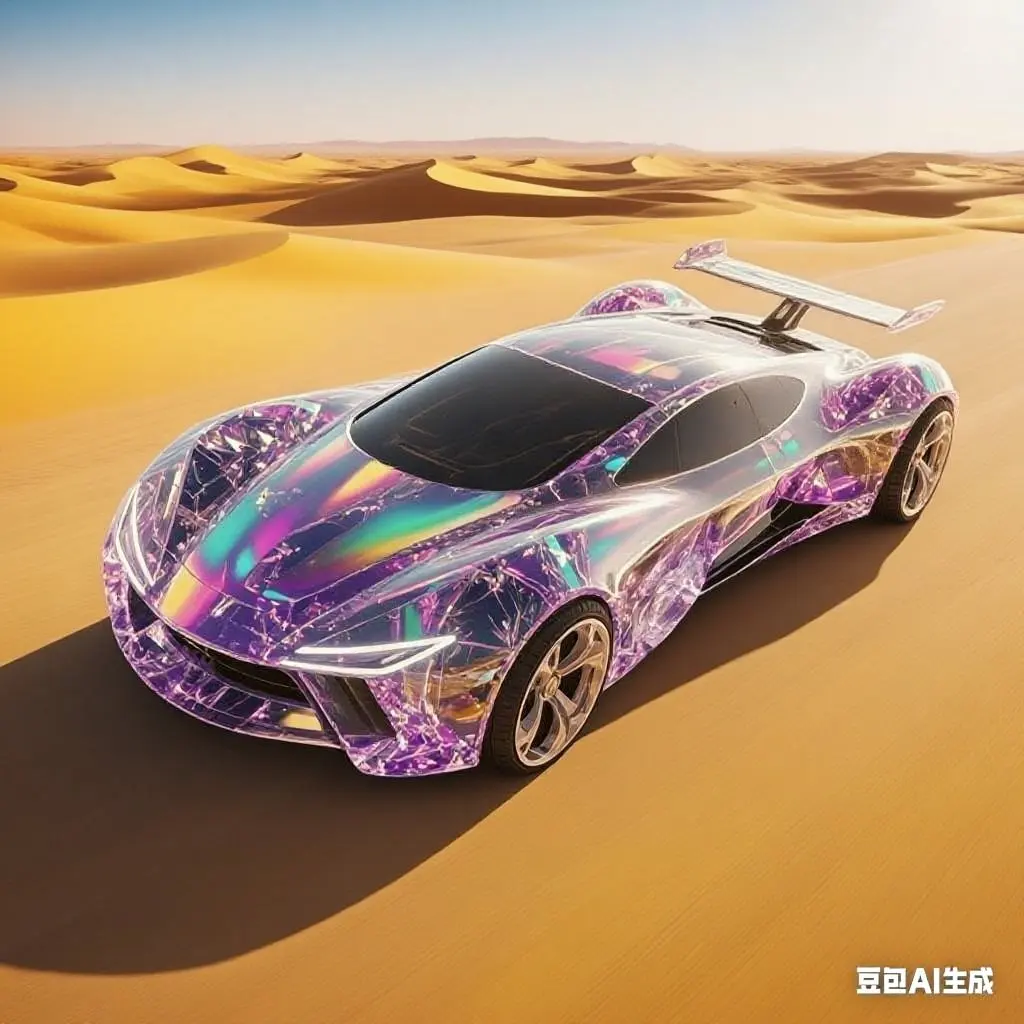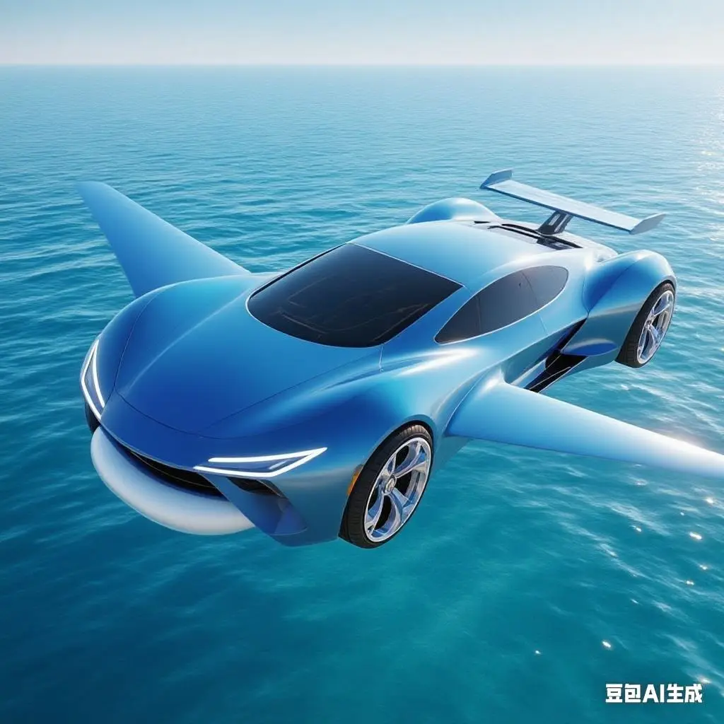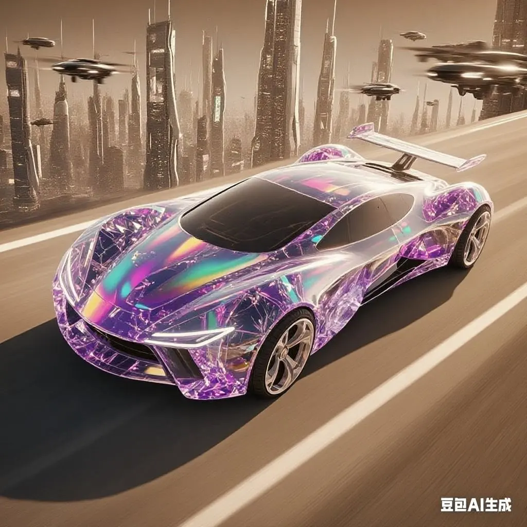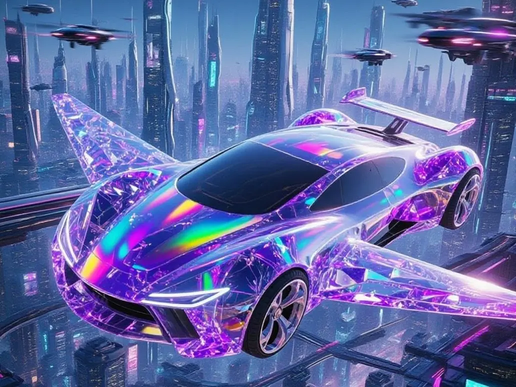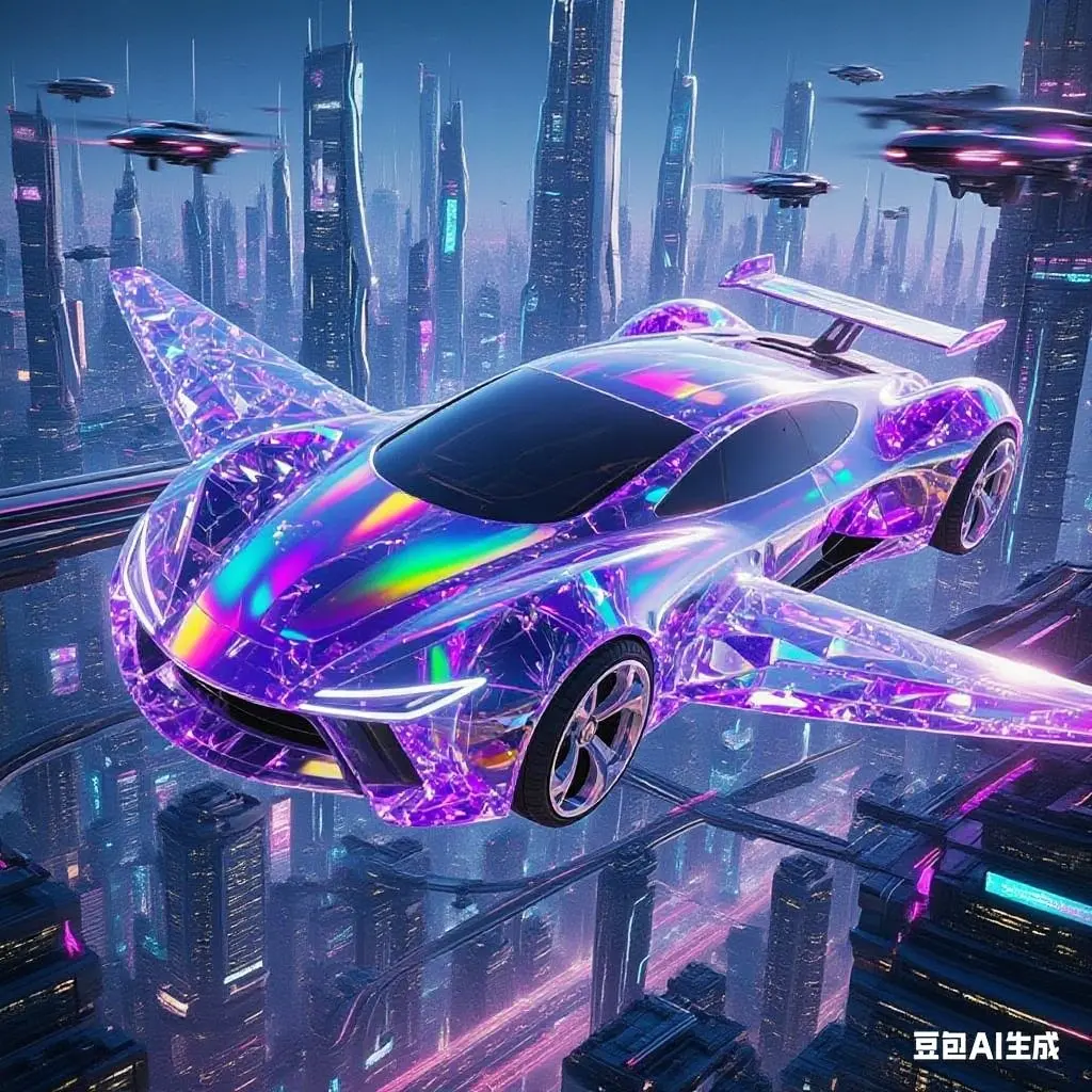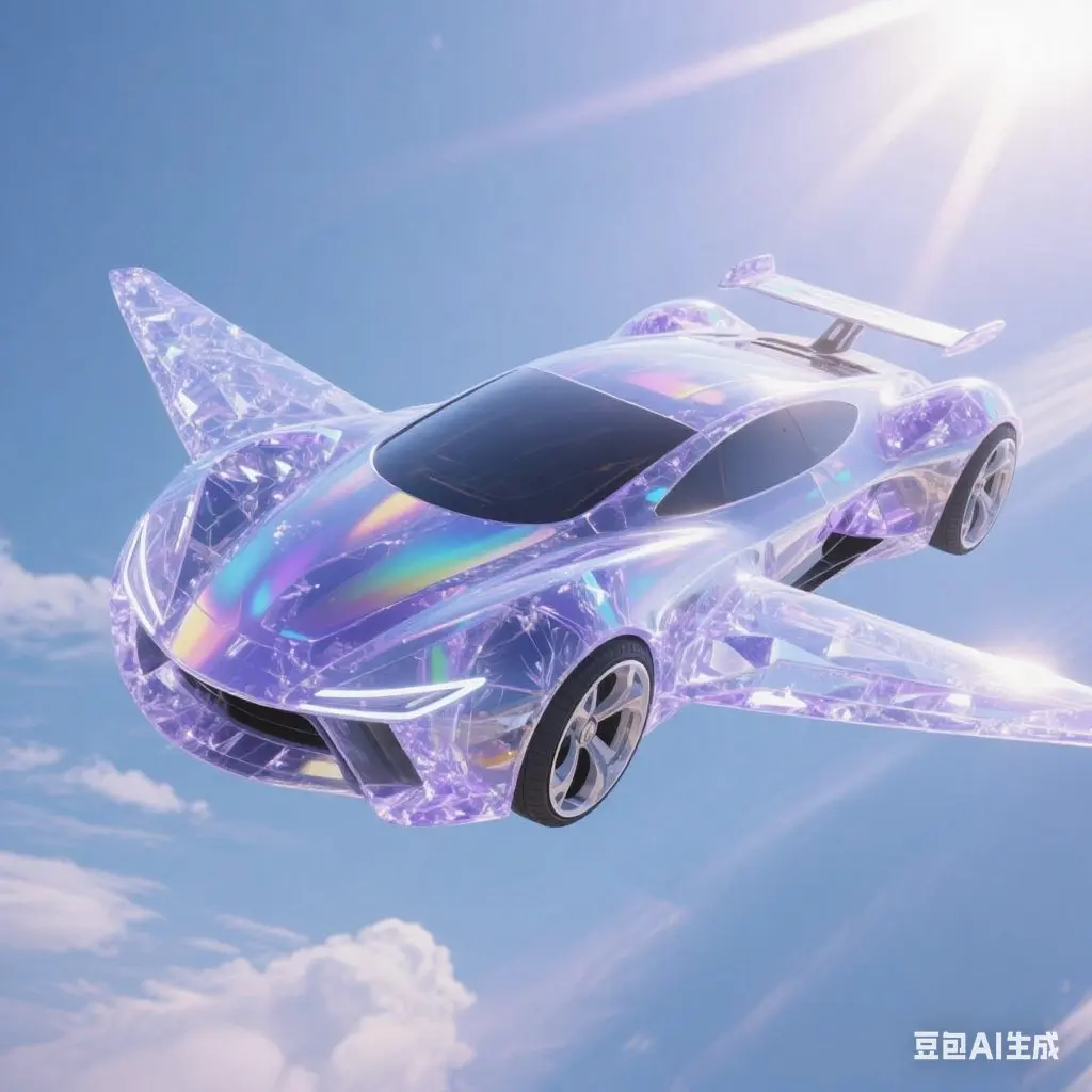 这飞行汽车就像从科幻电影里开出来的一样✨。整体造型如同一件精美的冰晶艺术品🧊,全透明的高强度纳米水晶车身,在阳光的照耀下折射出五彩斑斓的光芒🌈,每一个角度都散发着无与伦比的未来感和科技感。