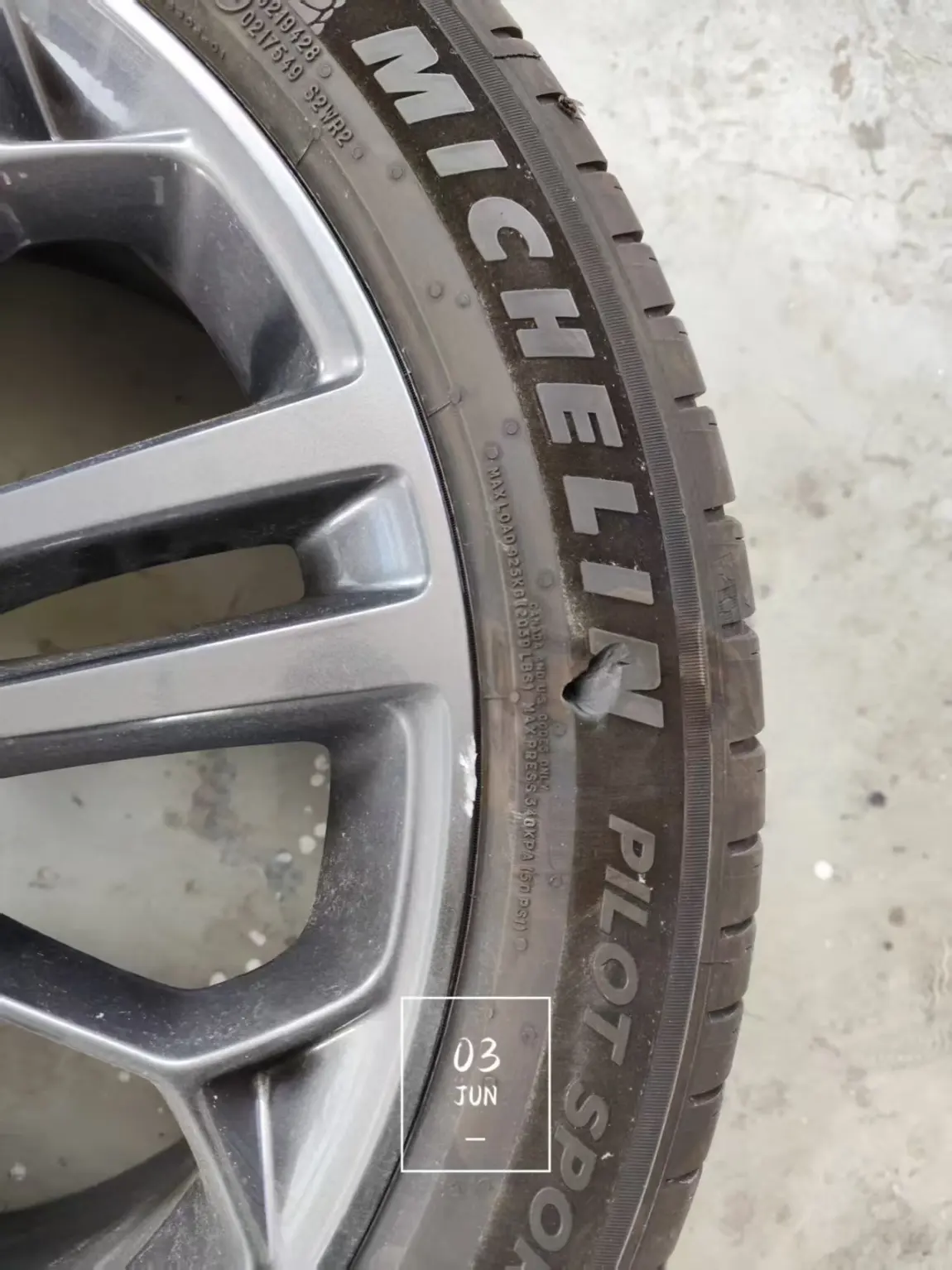关键兄弟有事借开出去办事,没想到出现意外,不小心刮到路牙, 外围轮胎给磕破了,挨了个我去😱