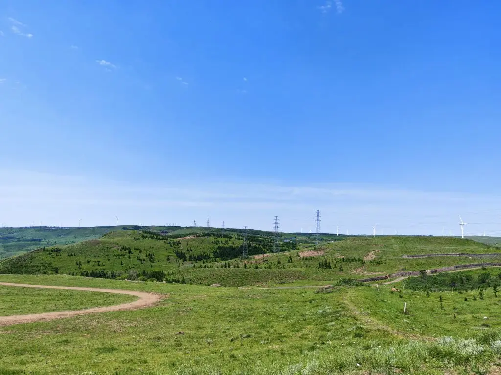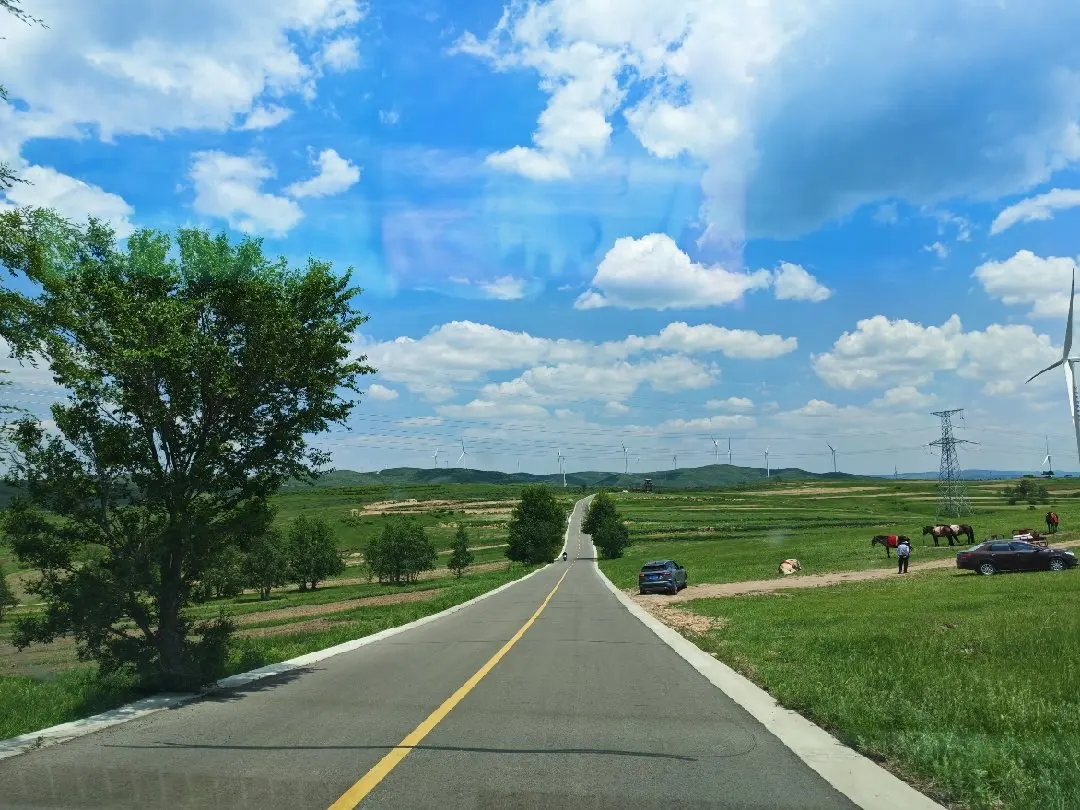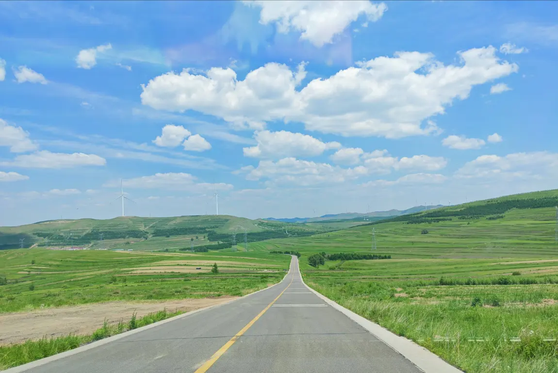车轮碾过蜿蜒的柏油路,窗外的绿色波涛从坝上高原倾泻而下。六月正午的阳光携着跨过山巅的风,吹拂在草原连绵的草甸上,每一株牧草都挺直了腰杆,折射出翡翠般的光泽。