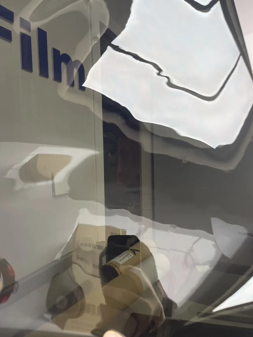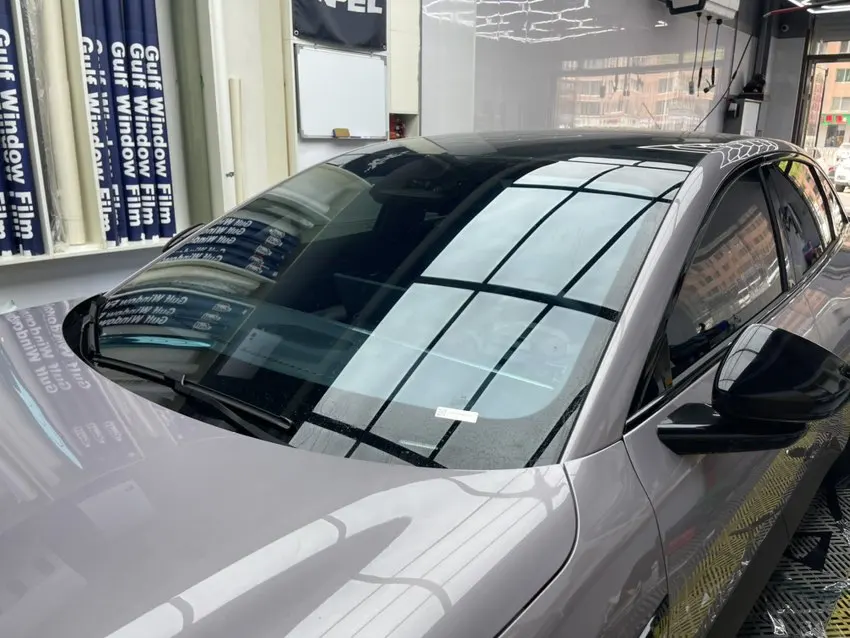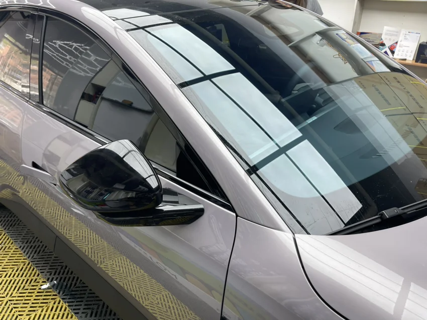 室内效果前风挡膜淡蓝色,从外侧向内侧看车窗比较黑,隐私性很好
