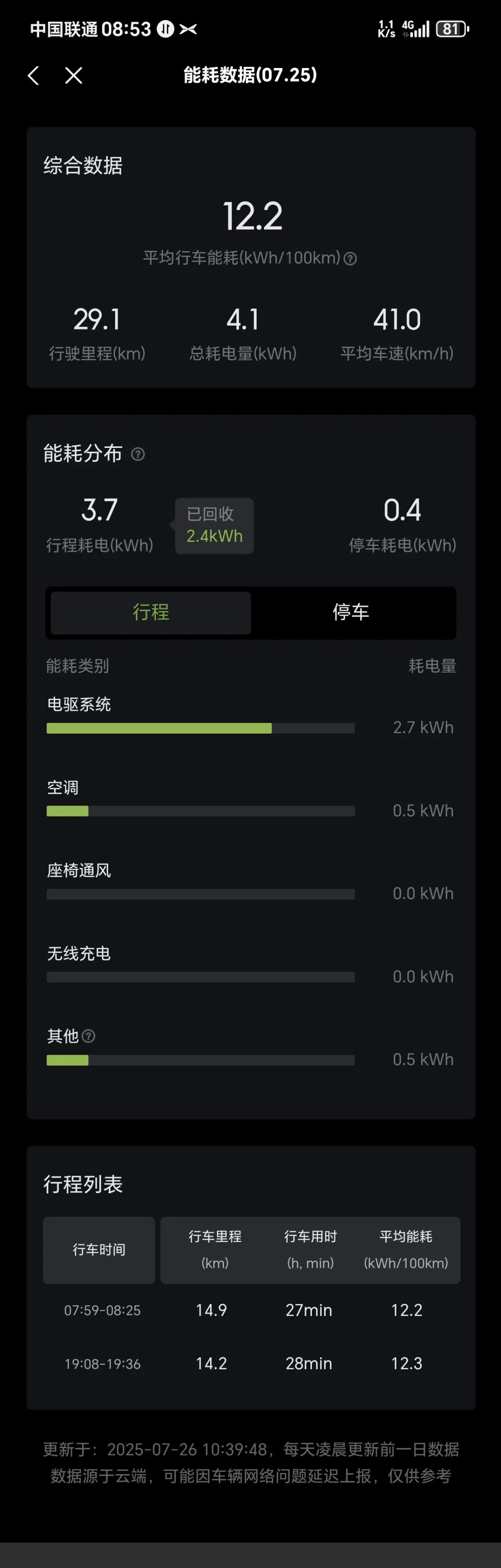 • 单次行程记录:2025年7月25日,全程29km(城市道路+高架),空调24℃、风量2档,能耗12.2kWh/100km。秘诀是提前规划路线避开拥堵,全程使用“舒适模式+高动能回收”,减少急加速。