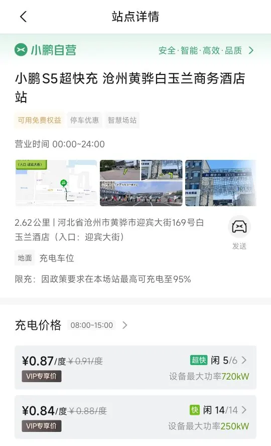 地址在沧州黄骅白玉兰商务酒店站,充电时间选在上午七点,早上充电费用最低价格最实惠。家距离充电站大概3公里,早上不堵车10分钟就到了。