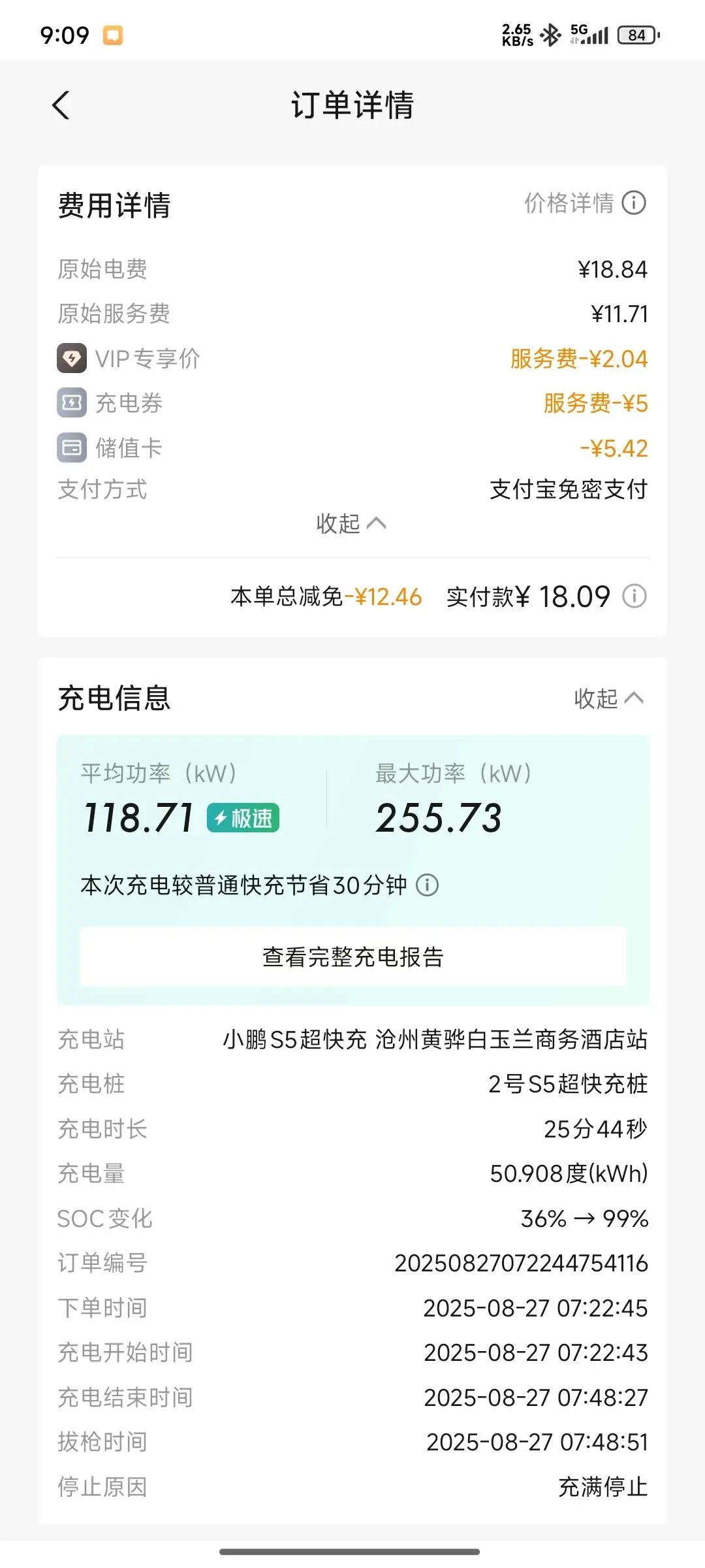 💸 说说费用,原始电费18.84元、服务费11.71元 ,不过用完了VIP专享、充电券这些优惠,总共减了12.46元,实付18.09元 。如果有充电券和官方活动优惠,这价格比用家充还省钱,省了钱又省了时间,太香啦!