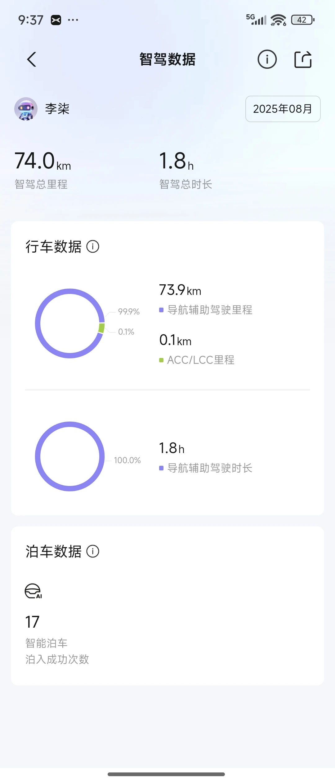 七月底提的车,正好一个月了,提车当天就完成了智驾考试。
