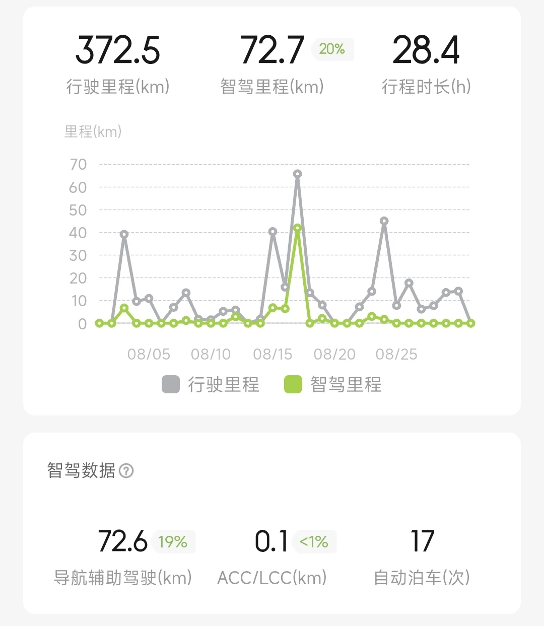 这一个月来,车开的很少,因为通勤距离只有3公里,而且路况比较复杂,本身行驶距离就没多少,导致智驾用的也不多。