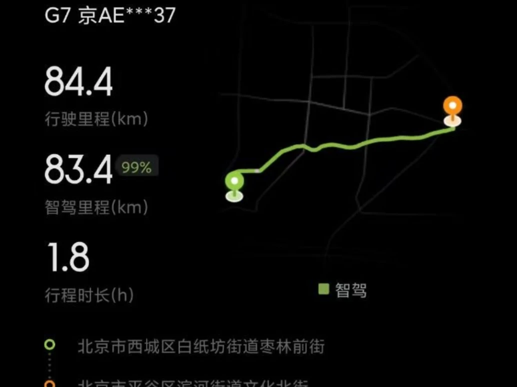 9月1日,11点多OTA推送AI智能辅助驾驶到车,进行了设置,学习一下怎么进行操控。就以辅助驾驶为主,人机共驾为辅,从北京开到了平谷八九十公里,智驾在92%以上。一路上强烈感受到了辅助驾驶的智能魅力,拥挤路段安全距离的跟车红绿灯的平稳启停,自主快速超车并道进入匝道。感觉比人还丝滑平稳。最高智驾记录99%。