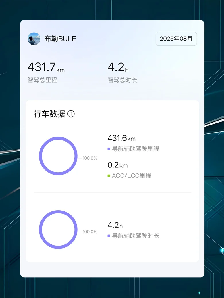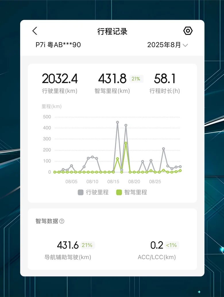 整个8月份我的智驾里程达到431.8公里,智驾时长4.2小时,占8月总里程21%,从数据上看我的智驾里程跟社区里的其他智驾大佬对比并不算太多。当然也是有原因的,我的Pro版车型本身的限制,以及我喜欢自己驾驶P7i时感受驾控的乐趣。