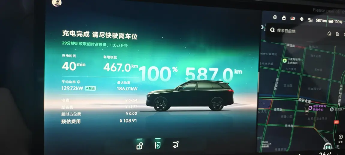充电去的小鹏自营的超充站,20的电量一直充到100,半个多时充满,停车还免费!