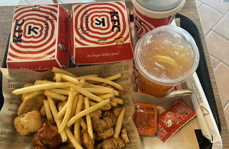 走了一圈,我发现小镇里面商业的业态也很丰富:包含特色餐饮、文创零售、咖啡馆、酒吧、kfc等,基本能满足吃喝玩乐购,并且价格也不是很高。因为小朋友还处在大部分的餐饮都不能吃,晚餐吃了kfc,点了汉堡和其他小吃,让小朋友吃面包胚+奶哈哈哈哈。