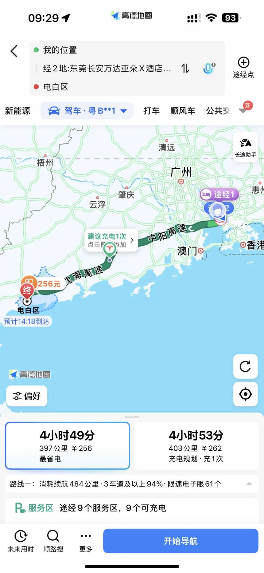 从深圳出发,先去接两个朋友,一个朋友在东莞长安,另外两个在福永。然后再从深圳福永上高速,走深中通道,主要走中阳高速和沈海高速到电白。从导航上看距离一共397公里,4个多小路程,过路费256元。